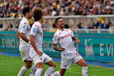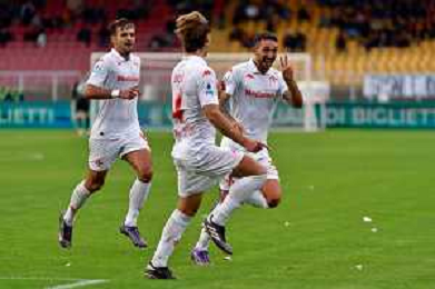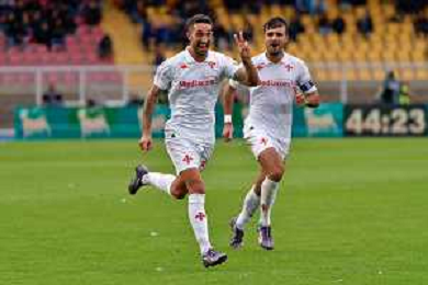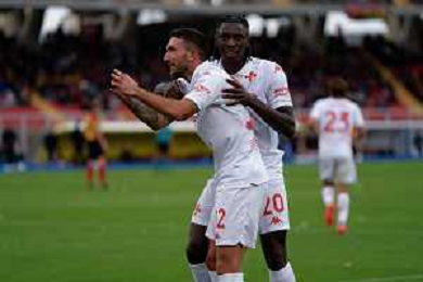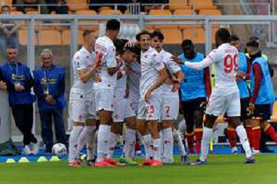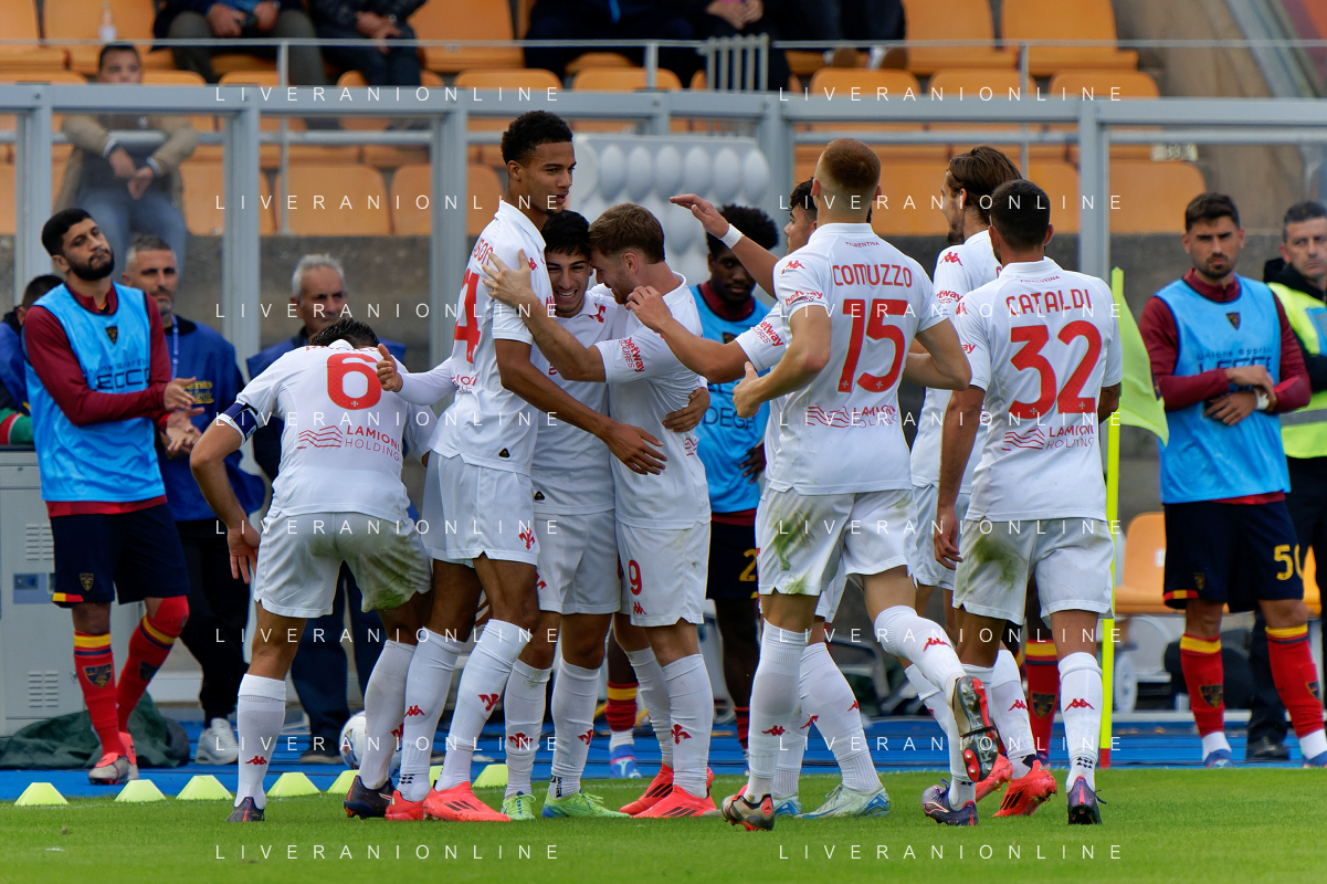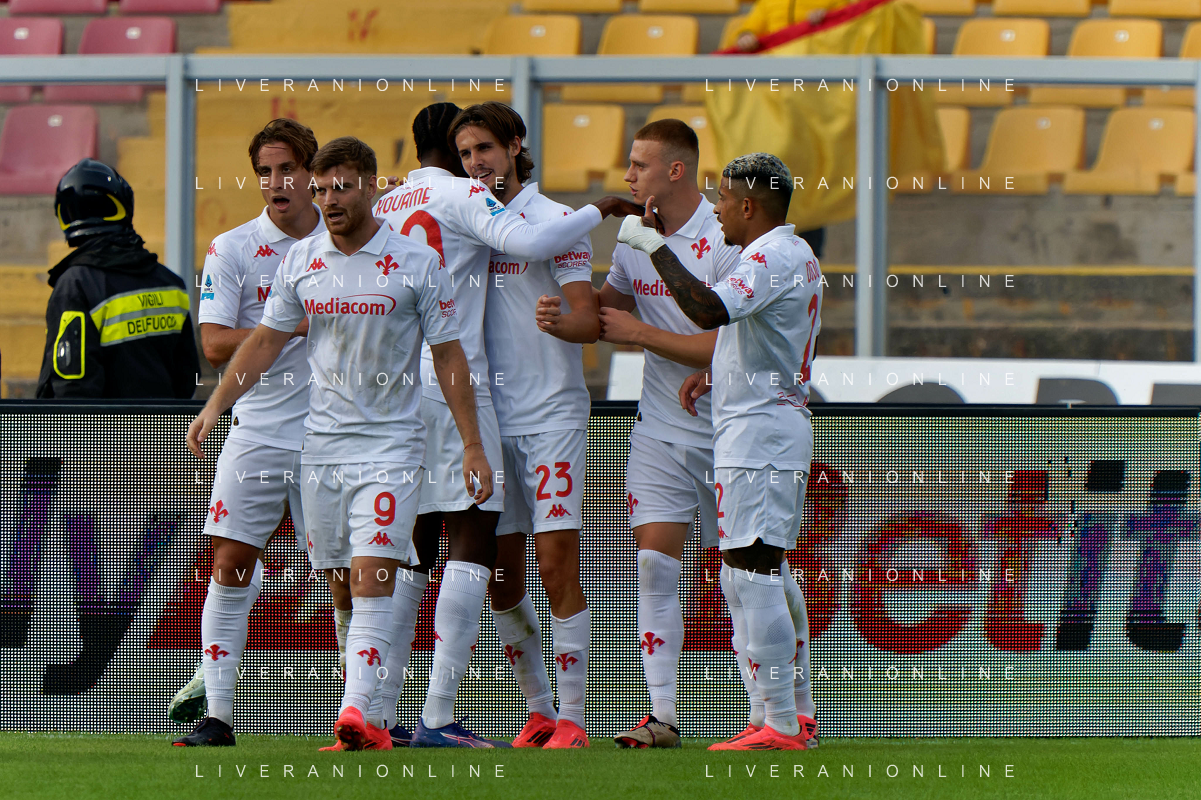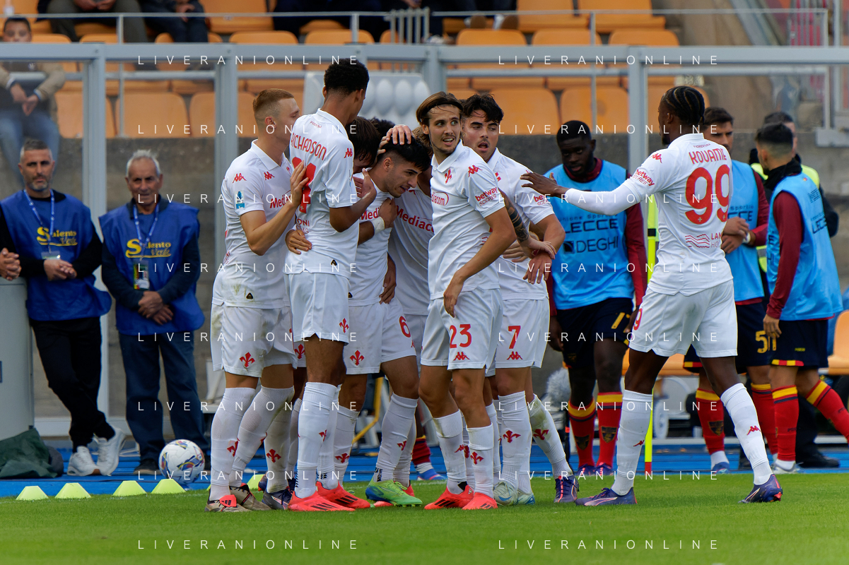 TVEM October 20, 2024 Lecce, Italy - US Lecce vs ACF Fiorentina - Italian soccer serie A 2024/25 - Via Del Mare Stadium. In the pic: Andrea Colpani of Fiorentina celebrates after scoring a goal with teammates foto emmanuele mastrodonato-ag aldo liverani sas