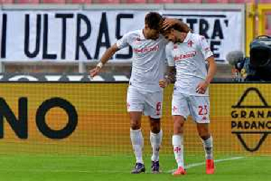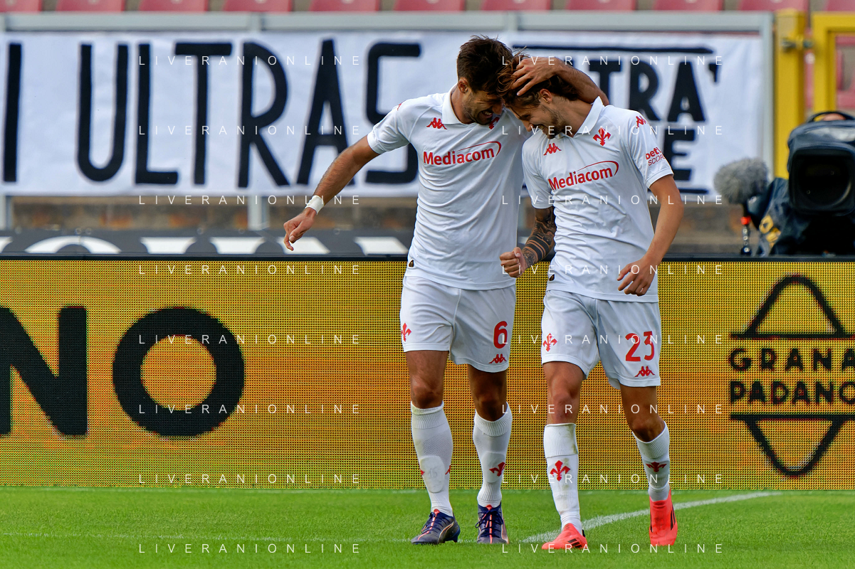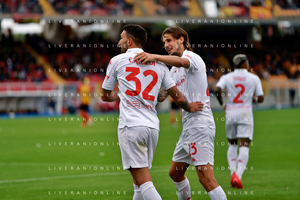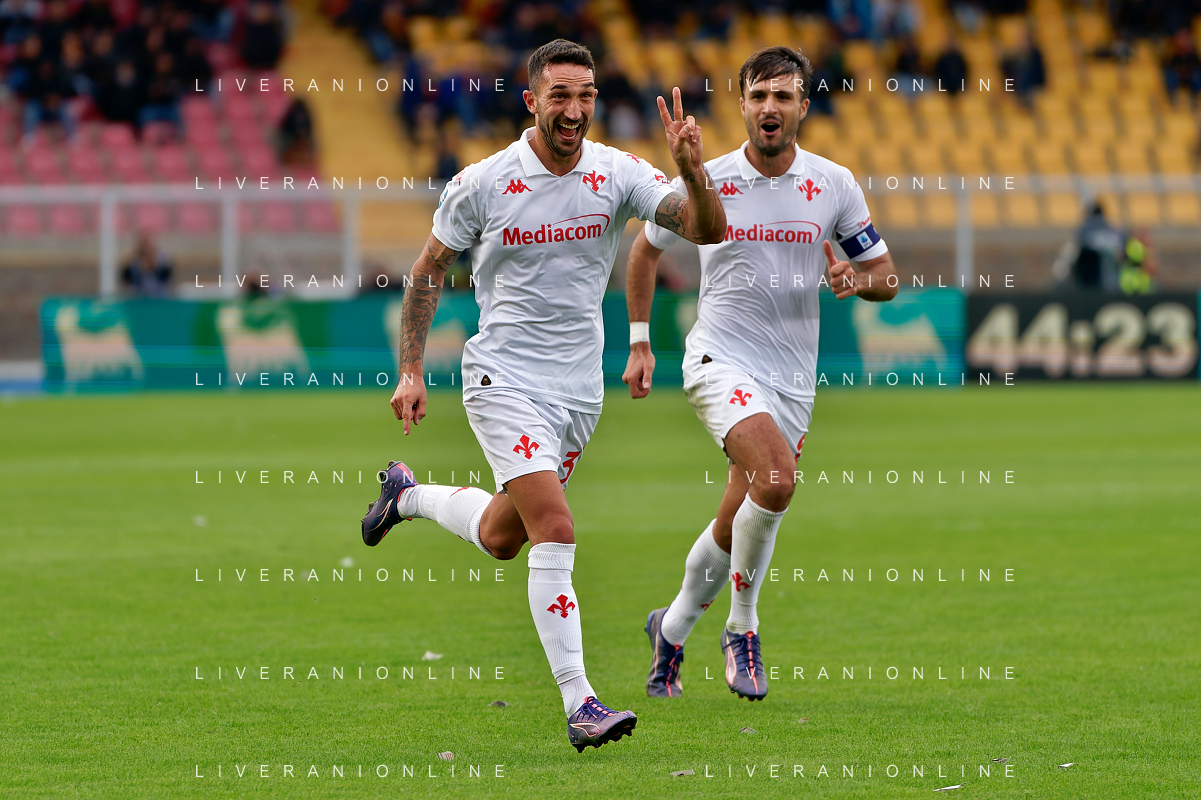 TVEM October 20, 2024 Lecce, Italy - US Lecce vs ACF Fiorentina - Italian soccer serie A 2024/25 - Via Del Mare Stadium. In the pic: Andrea Colpani of Fiorentina celebrates after scoring a goal with Luca Ranieri of Fiorentina foto emmanuele mastrodonato-ag aldo liverani sas