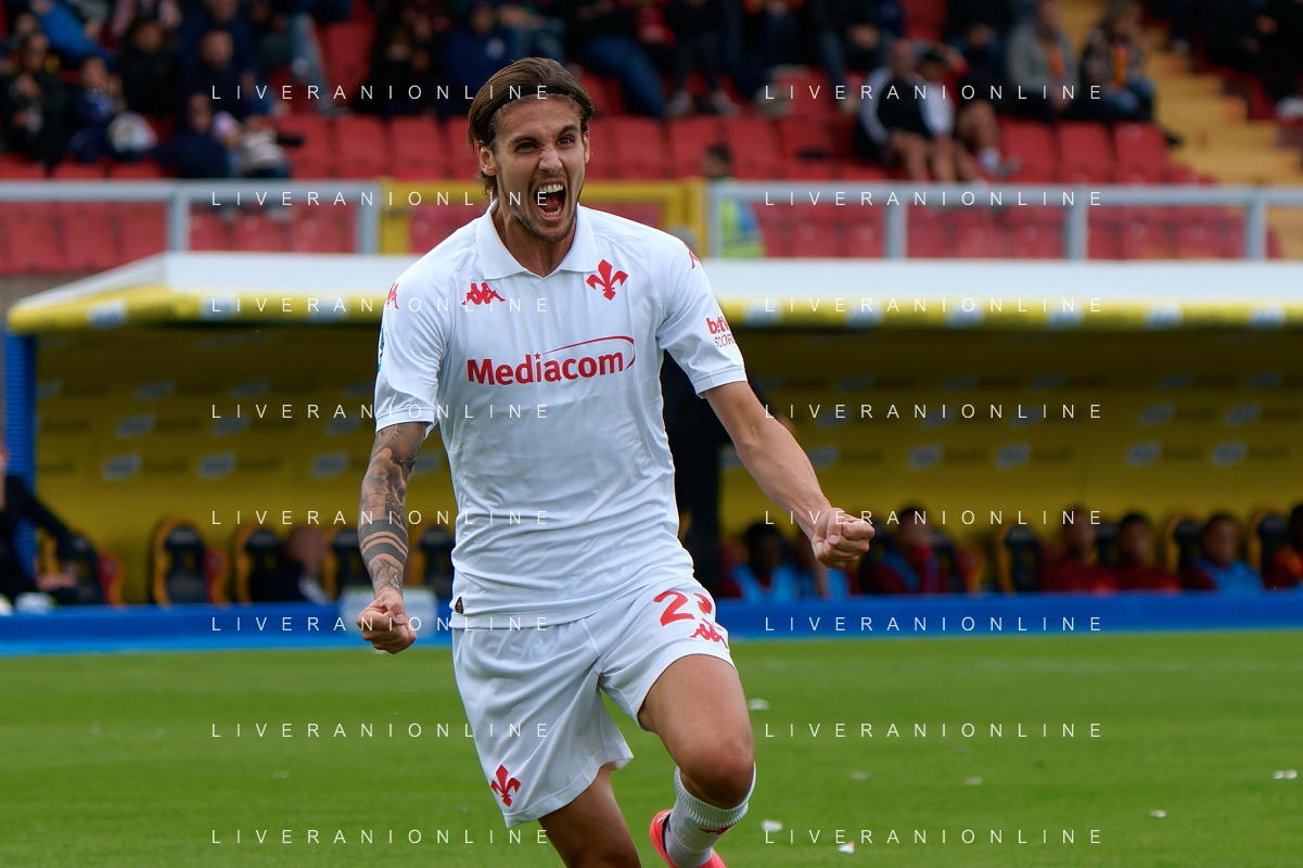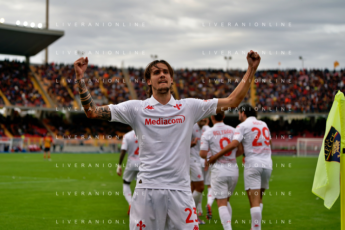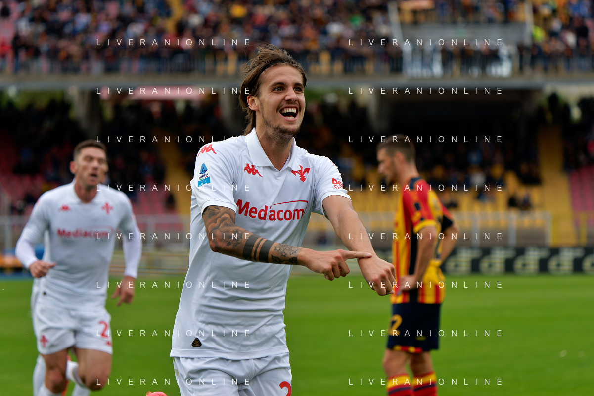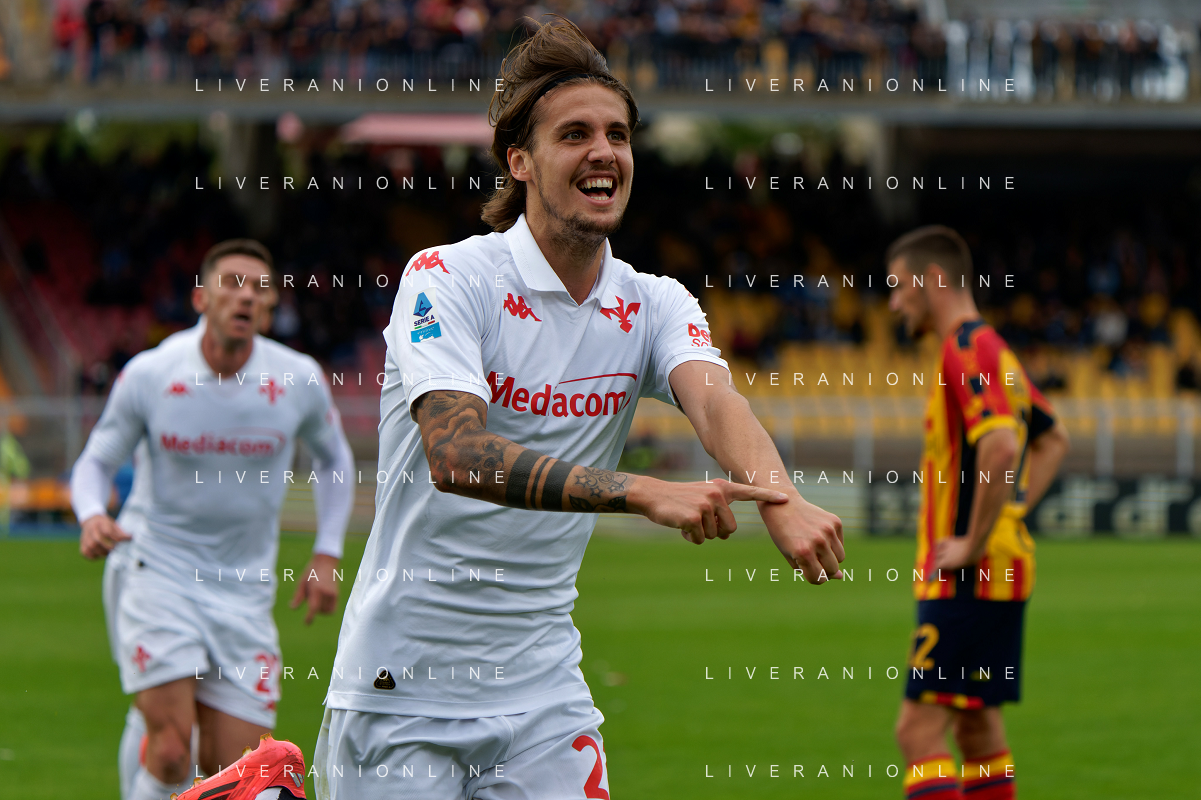TVEM October 20, 2024 Lecce, Italy - US Lecce vs ACF Fiorentina - Italian soccer serie A 2024/25 - Via Del Mare Stadium. In the pic: Andrea Colpani of Fiorentina celebrates after scoring a goal foto emmanuele mastrodonato-ag aldo liverani sas