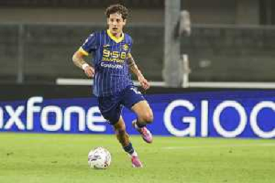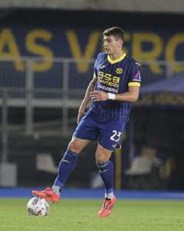 Jackson Tchatchoua of Hellas Verona FC play the ball during Hellas Verona FC vs AC Monza, 8° Serie A Enilive 2024-25 game at Marcantonio Bentegodi Stadium in Verona (VR), Italy, on October 21, 2024. (Photo by Davide Casentini) /AGENZIA ALDO LIVERANI SAS