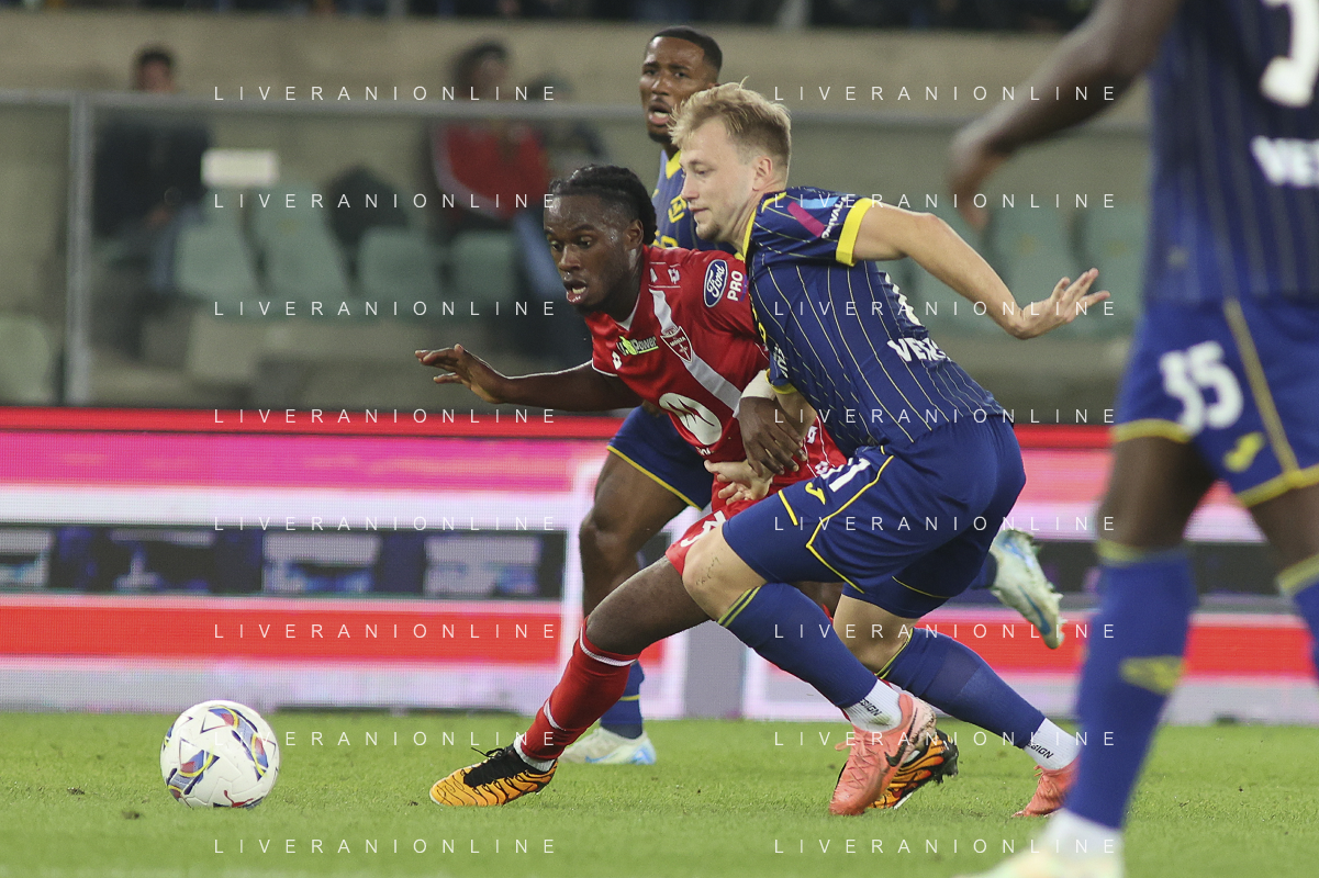 Ondrej Duda of Hellas Verona FC battle for the ball with Warren Bondo of AC Monza during Hellas Verona FC vs AC Monza, 8° Serie A Enilive 2024-25 game at Marcantonio Bentegodi Stadium in Verona (VR), Italy, on October 21, 2024. (Photo by Davide Casentini) /AGENZIA ALDO LIVERANI SAS