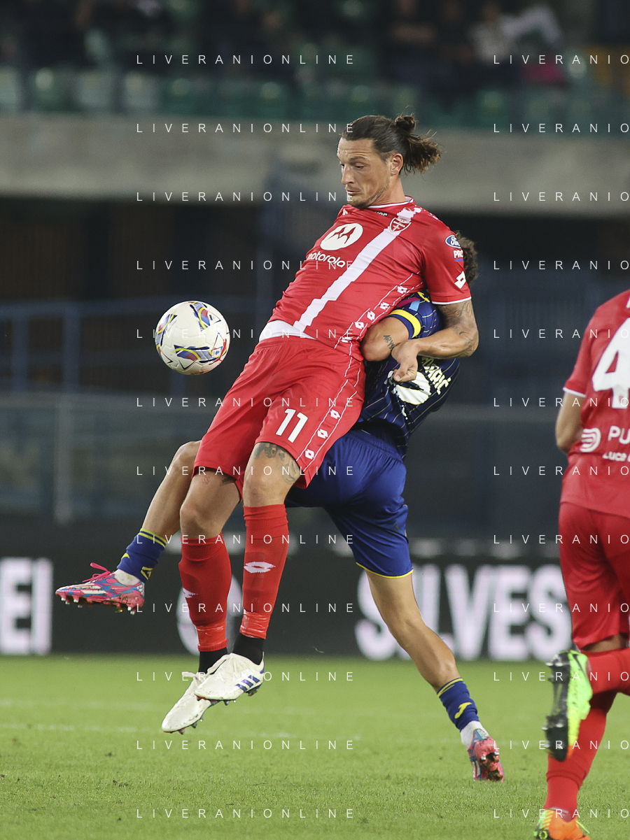 Gianluca Caprari of AC Monza competes for the ball with Giangiacomo Magnani of Hellas Verona FC during Hellas Verona FC vs AC Monza, 8° Serie A Enilive 2024-25 game at Marcantonio Bentegodi Stadium in Verona (VR), Italy, on October 21, 2024. (Photo by Davide Casentini) /AGENZIA ALDO LIVERANI SAS