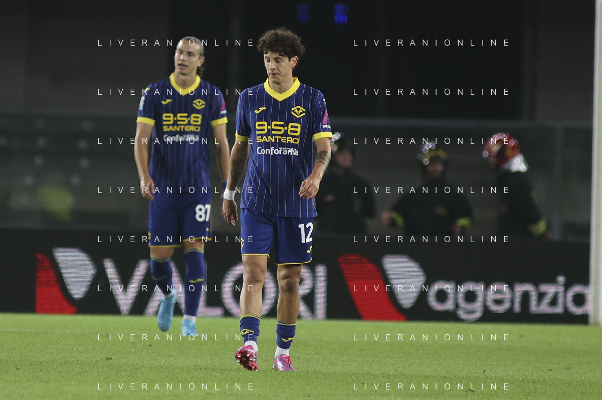 Hellas Verona players expresses disappointment afther Dany Mota Carvalho of AC Monza goal during Hellas Verona FC vs AC Monza, 8° Serie A Enilive 2024-25 game at Marcantonio Bentegodi Stadium in Verona (VR), Italy, on October 21, 2024. (Photo by Davide Casentini) /AGENZIA ALDO LIVERANI SAS