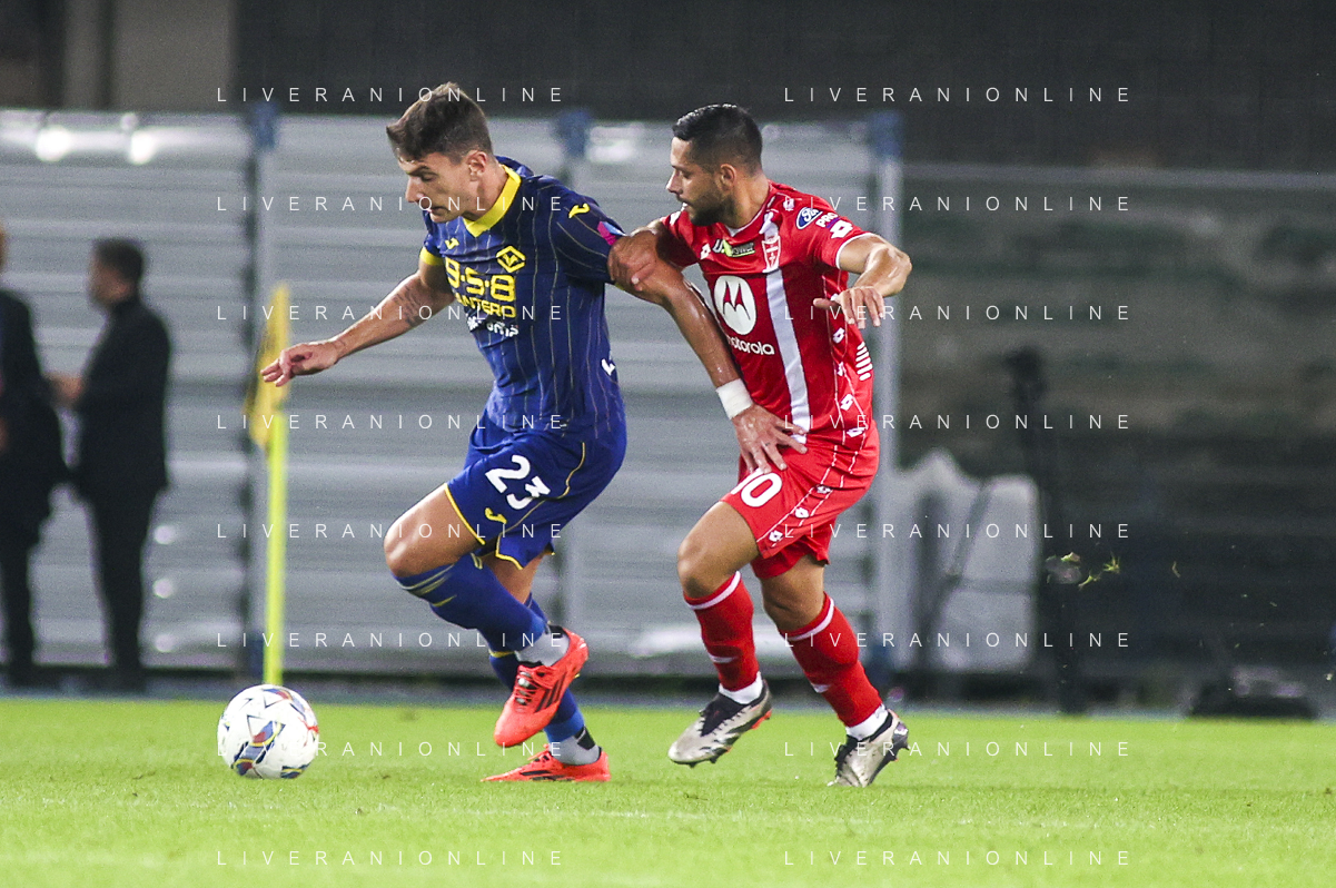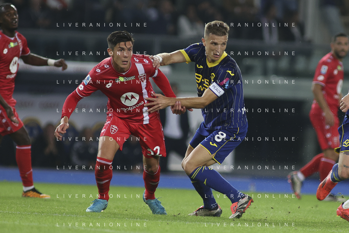 Domagoj Bradaric of Hellas Verona FC competes for the ball with Pedro Pereira of AC Monza during Hellas Verona FC vs AC Monza, 8° Serie A Enilive 2024-25 game at Marcantonio Bentegodi Stadium in Verona (VR), Italy, on October 21, 2024. (Photo by Davide Casentini) /AGENZIA ALDO LIVERANI SAS