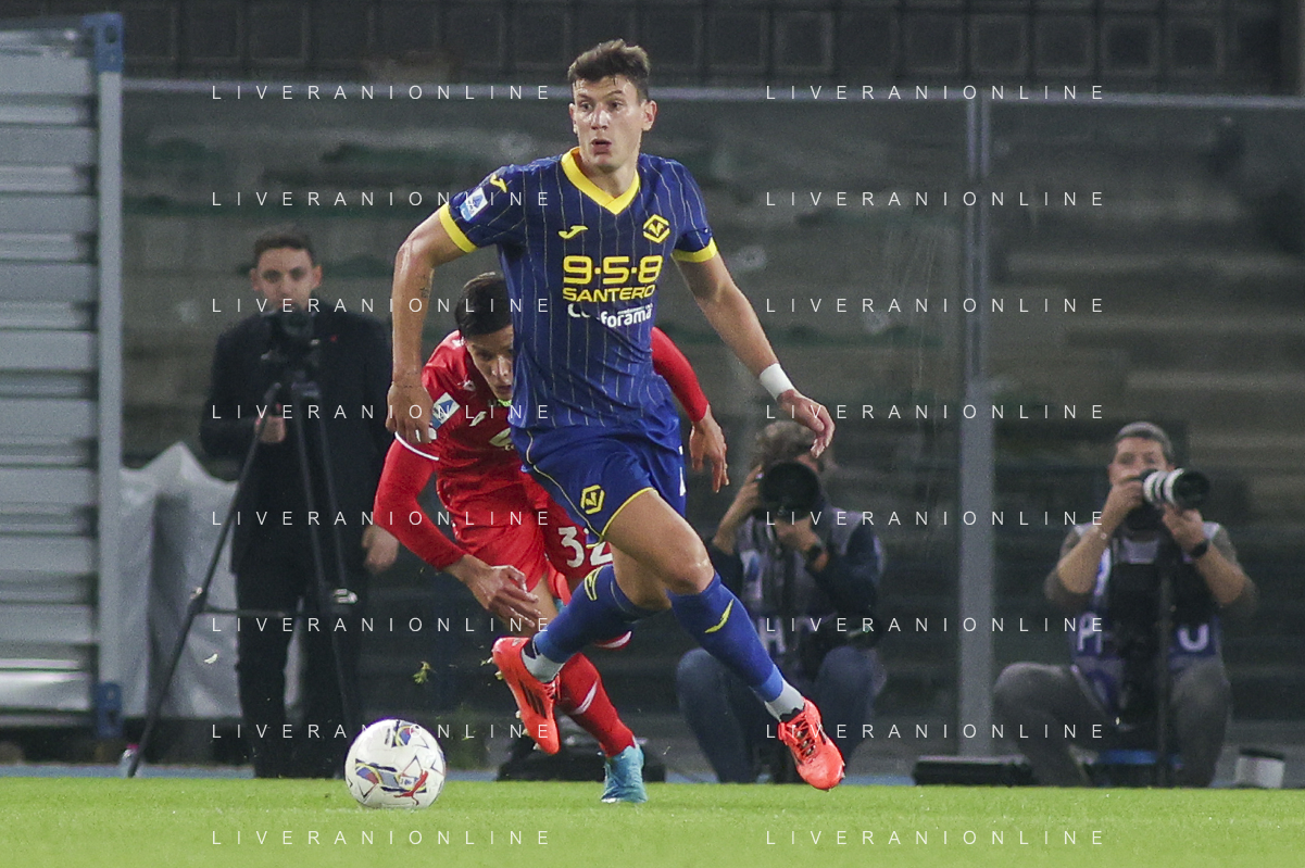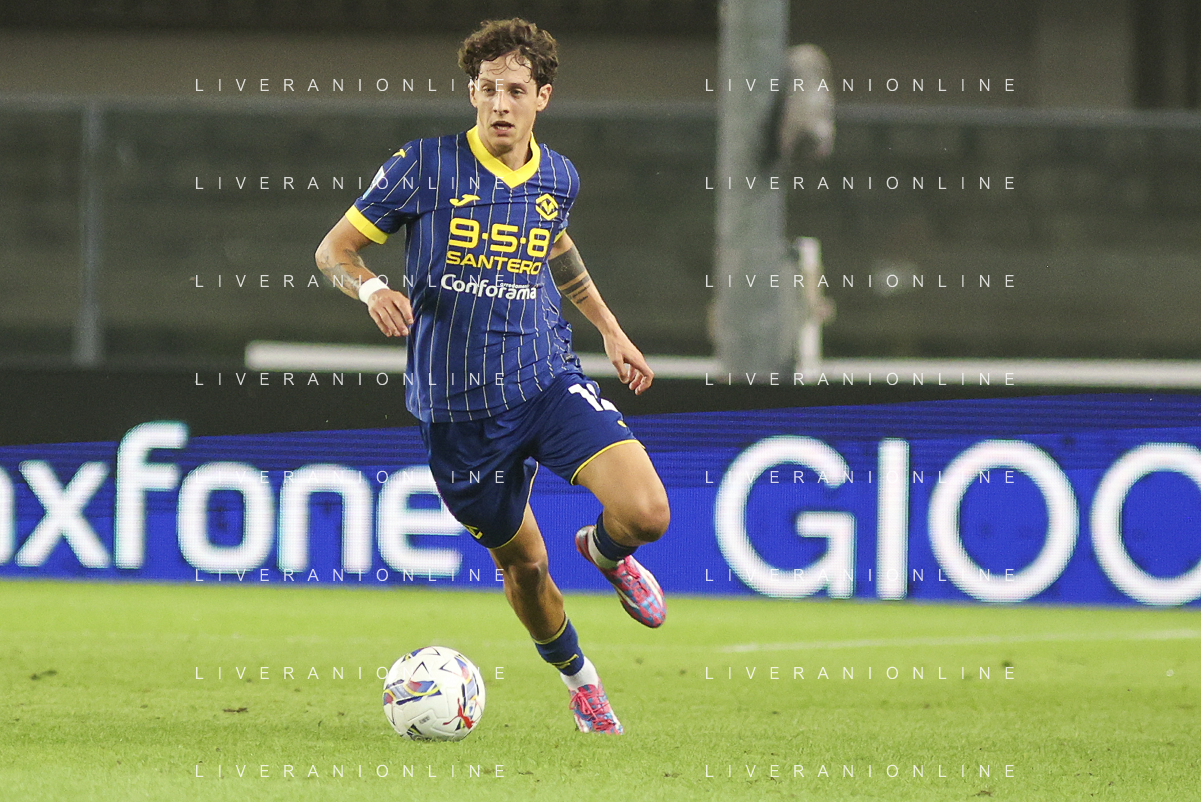 Giangiacomo Magnani of Hellas Verona FC play the ball during Hellas Verona FC vs AC Monza, 8° Serie A Enilive 2024-25 game at Marcantonio Bentegodi Stadium in Verona (VR), Italy, on October 21, 2024. (Photo by Davide Casentini) /AGENZIA ALDO LIVERANI SAS