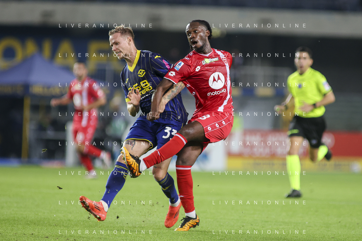 Casper Tengstedt of Hellas Verona FC competes for the ball with Warren Bondo of AC Monza during Hellas Verona FC vs AC Monza, 8° Serie A Enilive 2024-25 game at Marcantonio Bentegodi Stadium in Verona (VR), Italy, on October 21, 2024. (Photo by Davide Casentini) /AGENZIA ALDO LIVERANI SAS