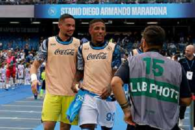 TVEM October 26, 2024 Napoli, Italy - SSC Napoli vs US Lecce - Italian soccer serie A 2024/25 - Diego Armando Maradona Stadium. In the pic: Elia Caprile of SSC Napoli and Michael Folorunsho of SSC Napoli ©Emmanuele Mastrodonato/AGENZIA ALDO LIVERANI SAS