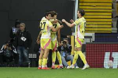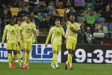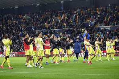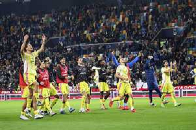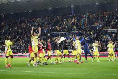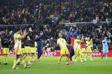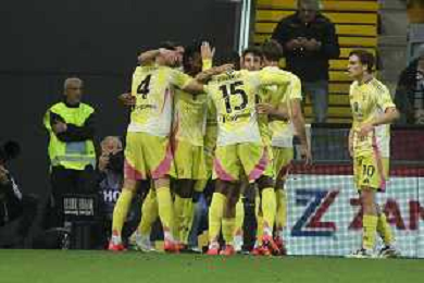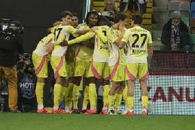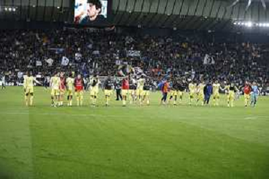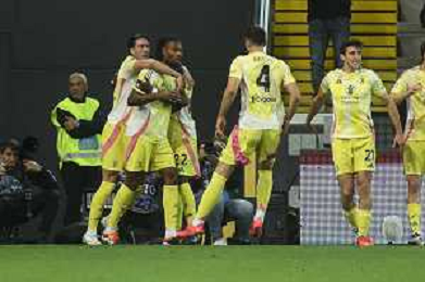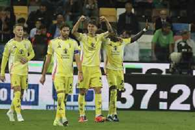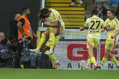 Juventus players celebrate the victory at the end of Udinese Calcio vs Juventus FC, 11° Serie A Enilive 2024-25 game at Bluenergy stadium in Udine (UD), Italy, on November 02, 2024. (Photo by Davide Casentini)- AGENZIA ALDO LIVERANI SAS