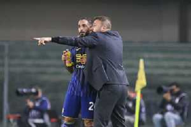 Paolo Zanetti Head Coach of Hellas Verona FC speaks to Grigoris Kastanos of Hellas Verona FC during Hellas Verona FC vs AS Roma, 11° Serie A Enilive 2024-25 game at Marcantonio Bentegodi stadium in Verona (VR), Italy, on November 03, 2024. (Photo by Davide Casentini)-AGENZIA ALDO LIVERANI SAS