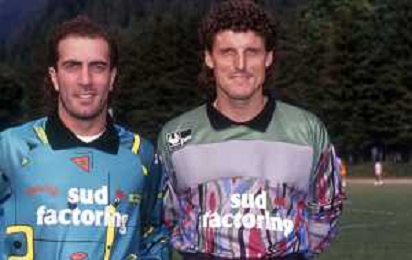 DIA- RETROSPETTIVA GIUSEPPE ALBERGA CALCIATORE DI RUOLO PORTIERE NELLA FOTO GIUSEPPE ALBERGA CON LA MAGLIA DEL BARI CALCIO NELL’ANNO 1991-1992 CON ENZO BIATO AG ALDO LIVERANI SAS