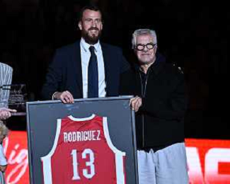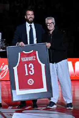 TVRG EA7 Emporio Armani Olimpia Milano vs Real Madrid nella foto Sergio Rodriguez e Pantaleo Dell'Orco presidente Olimpia Milano durante la celebrazione per l'ingresso nella Hall of Fame dell'Olimpia Milano Assago (MI) 07-11-2024 Unipol Forum Turkish Airlines EuroLeague 8a giornata regular season foto Roberto Garavaglia/Agenzia Aldo Liverani sas