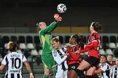 TVRG Juventus vs Milan nella foto Pauline Peyraud-Magnin (Juventus) anticipa Angelica Soffia (Milan) Biella 09-11-2024 Stadio Alessandro La Marmora - Vittorio Pozzo Campionato Serie A Femminile eBay - 9a giornata foto Roberto Garavaglia/Agenzia Aldo Liverani sas