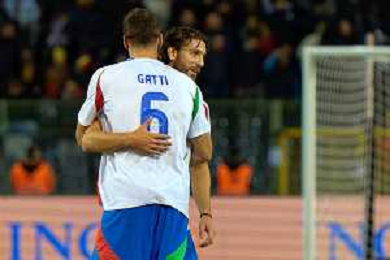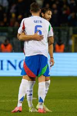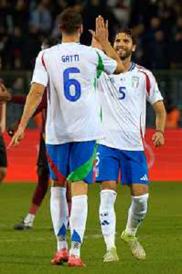 TVEM November 14, 2024 Brussels, Belgium - Belgium vs Italy - UEFA Nations League 2024/25, League A Group A2 match - King Baudouin Stadium. In the pic: Manuel Locatelli of Italy and Federico Gatti of Italy celebrates the victory FOTO EMMANUELE MASTRODONATO-AG ALDO LIVERANI SAS