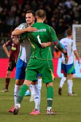 TVEM November 14, 2024 Brussels, Belgium - Belgium vs Italy - UEFA Nations League 2024/25, League A Group A2 match - King Baudouin Stadium. In the pic: Gianluigi Donnarumma of Italy and Alessandro Buongiorno of Italy celebrates the victory FOTO EMMANUELE MASTRODONATO-AG ALDO LIVERANI SAS