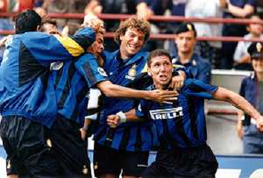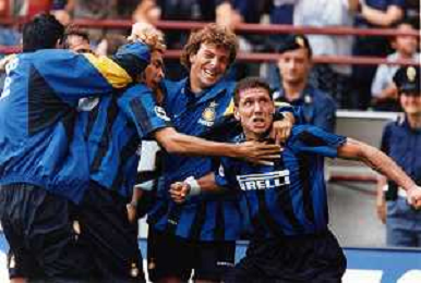 esultanza di Diego Pablo Simeone Calciatore dell'Internazionale con Ronaldo e Francesco Moriero Campionato 1997/1998 Ph archivio Ag. Aldo Liverani sas