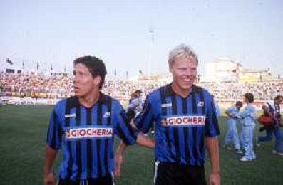 DIA-RETROSPETTIVA DIEGO PABLO SIMEONE CALCIATORE NELLA FOTO DIEGO PABLO SIMEONE CON LA MAGLIA DEL PISA CALCIO NELL’ANNO 1990-1991 CON HENRIK LARSEN AG ALDO LIVERANI SAS