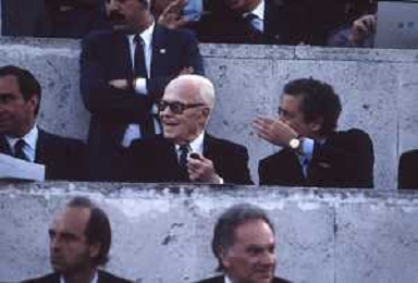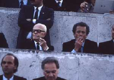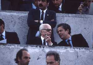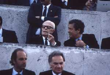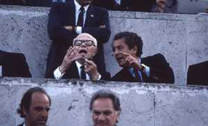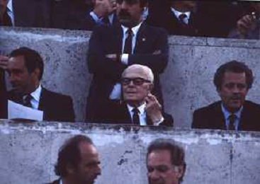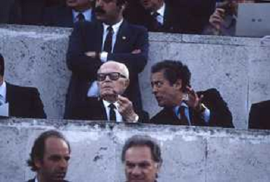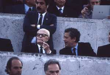DIAP-RETROSPETTIVA SANDRO PERTINI POLITICO E PRESIDENTE DELLA REPUBBLICA ITALIANA NELLA FOTO SANDRO PERTINI E FEDERICO SORDILLO PRESIDENTE DELLE FEDERAZIONE GIOCO CALCIO ITALIANA A ROMA NELLA FINALE DI COPPA CAMPIONI ROMA-LIVERPOOL NELL'ANNO 1984 AG ALDO LIVERANI SAS