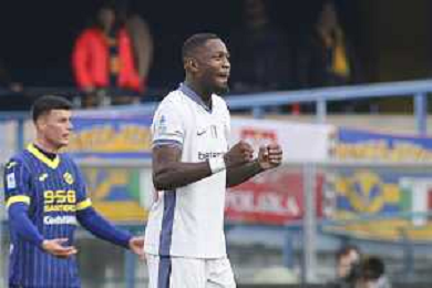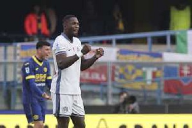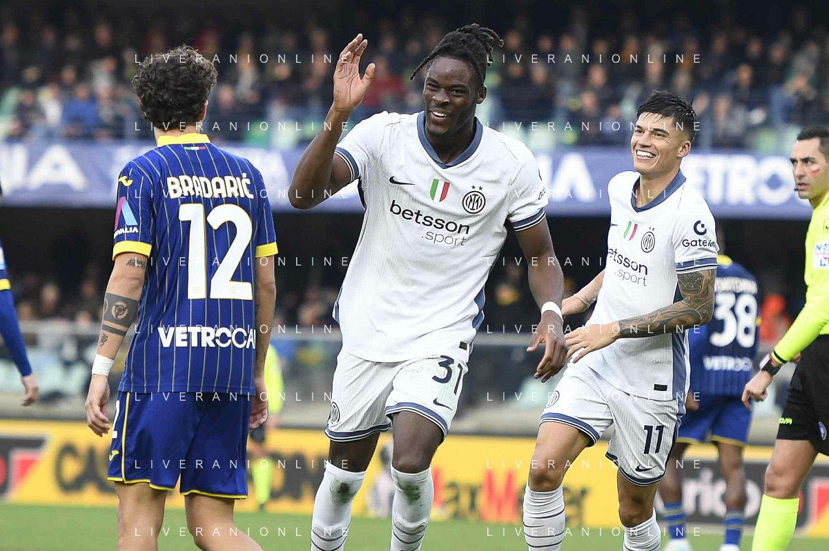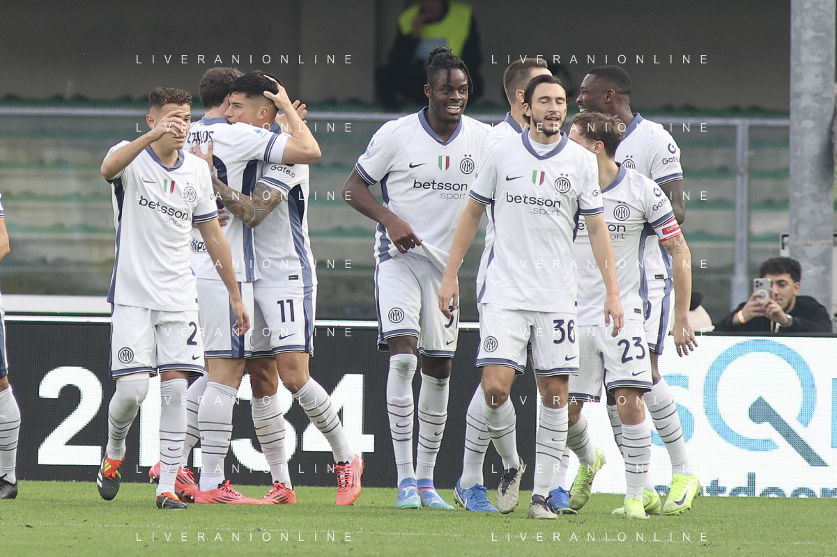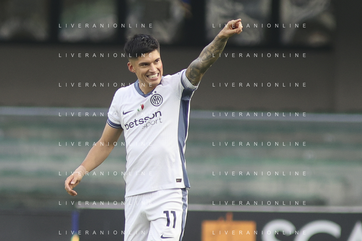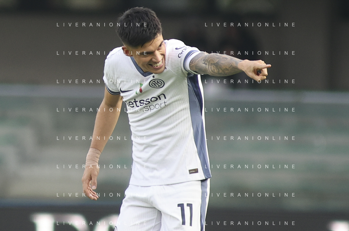 Marcus Thuram of Inter FC celebrates after scoring during Hellas Verona FC vs Inter FC, 13° Serie A Enilive 2024-25 game at Marcantonio Bentegodi stadium in Verona (VR), Italy, on November 23, 2024. (Photo by Davide Casentini)- AGENZIA ALDO LIVERANI SAS