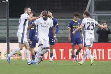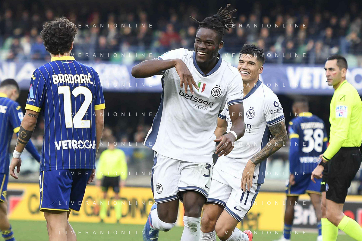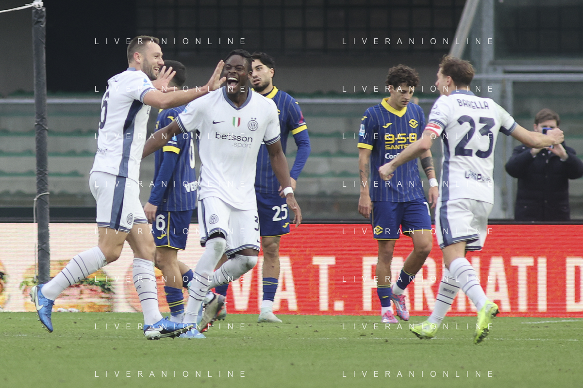 Yann Aurel Bisseck of Inter FC celebrates after scoring during Hellas Verona FC vs Inter FC, 13° Serie A Enilive 2024-25 game at Marcantonio Bentegodi stadium in Verona (VR), Italy, on November 23, 2024. (Photo by Davide Casentini)- AGENZIA ALDO LIVERANI SAS