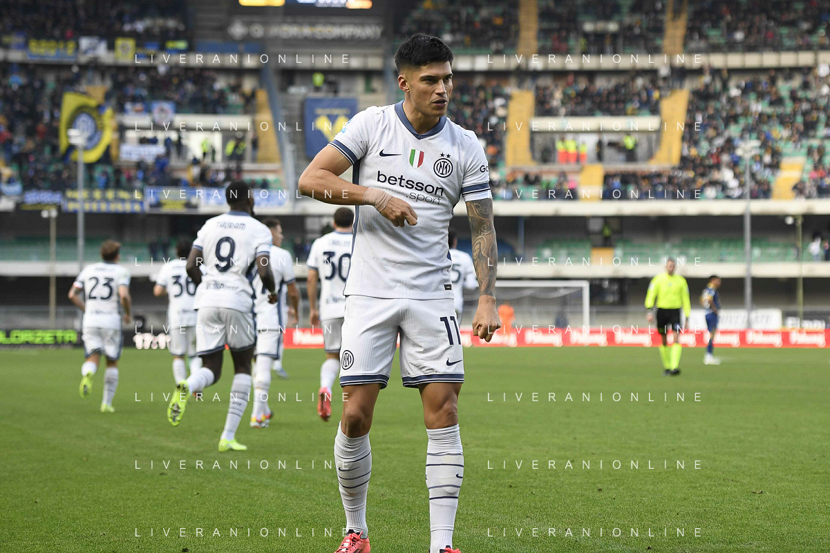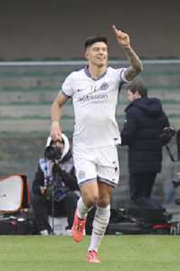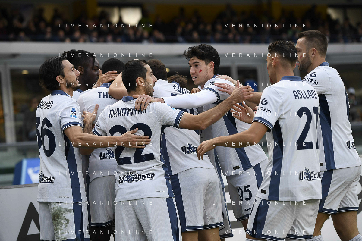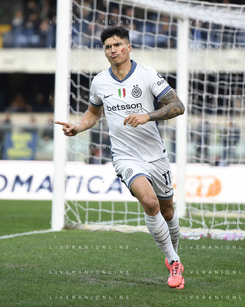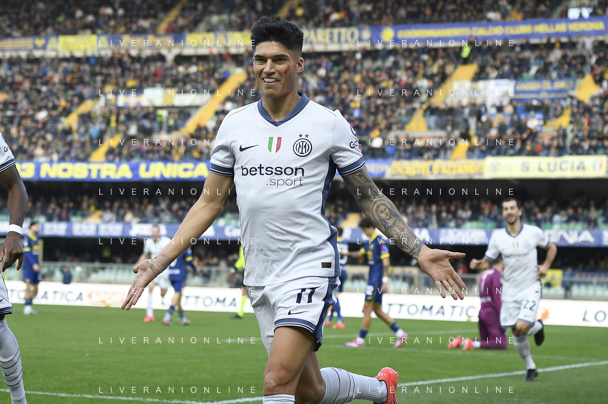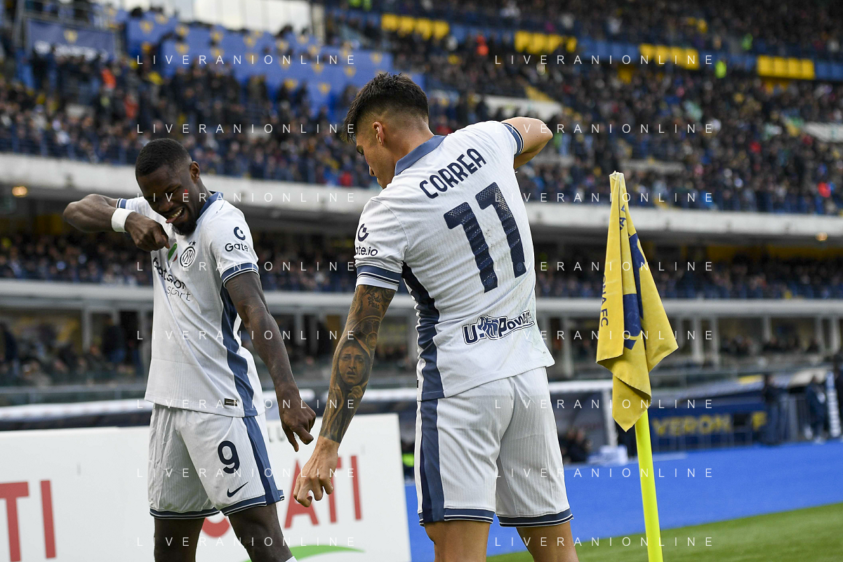 Joaquin Correa of Inter FC celebrates after scoring goal during Hellas Verona FC vs Inter FC, 13° Serie A Enilive 2024-25 game at Marcantonio Bentegodi stadium in Verona (VR), Italy, on November 23, 2024. (Photo by Davide Casentini)- AGENZIA ALDO LIVERANI SAS