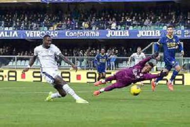 Yann Sommer of Inter FC makes a save on Daniel Mosquera of Hellas Verona FC during Hellas Verona FC vs Inter FC, 13° Serie A Enilive 2024-25 game at Marcantonio Bentegodi stadium in Verona (VR), Italy, on November 23, 2024. (Photo by Davide Casentini)- AGENZIA ALDO LIVERANI SAS