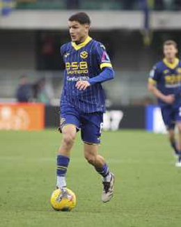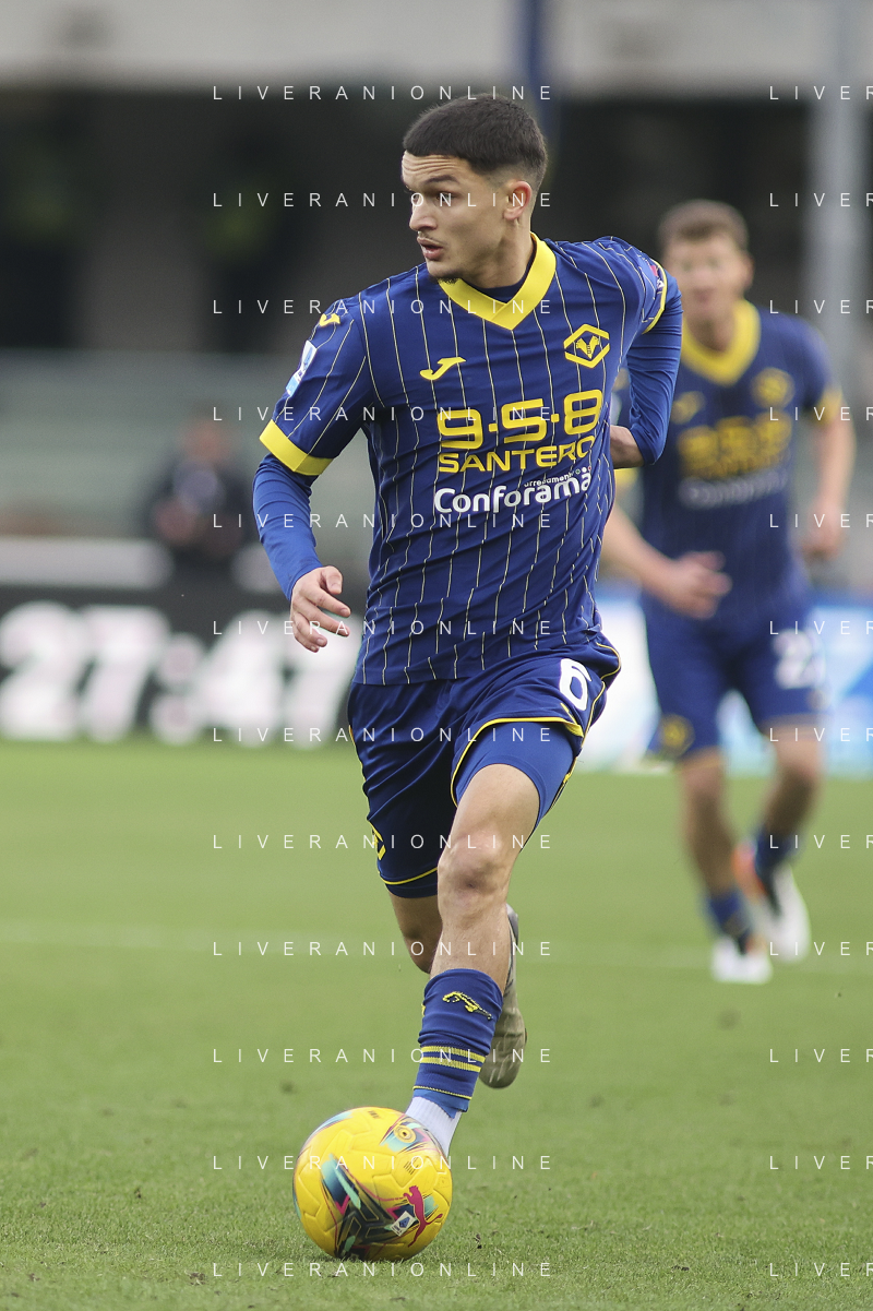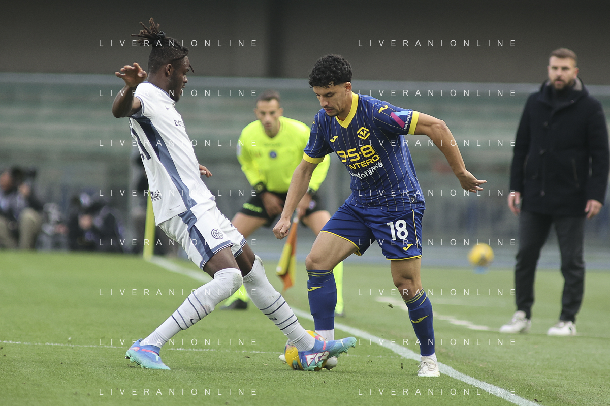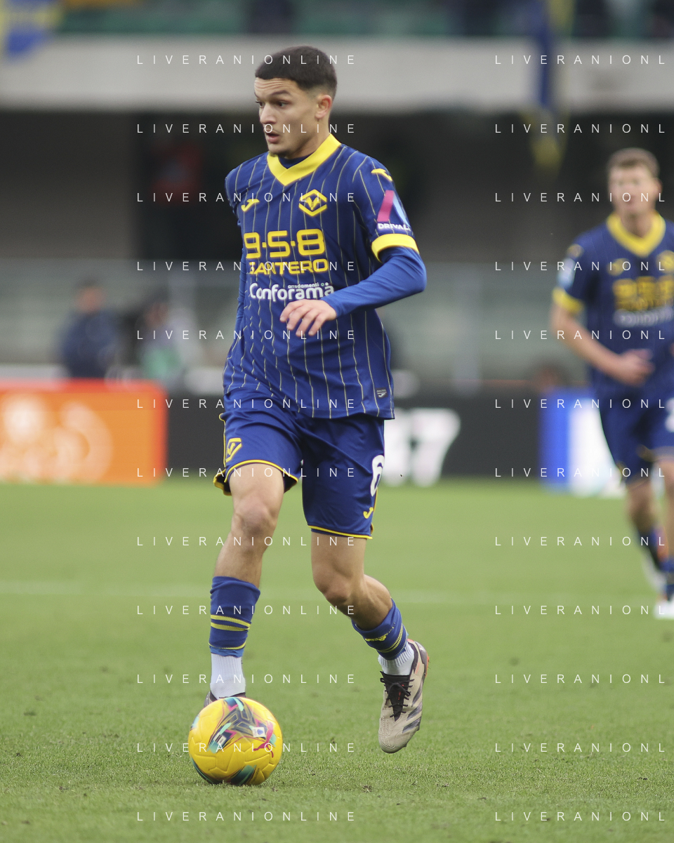 Reda Belahyane of Hellas Verona FC play the ball during Hellas Verona FC vs Inter FC, 13° Serie A Enilive 2024-25 game at Marcantonio Bentegodi stadium in Verona (VR), Italy, on November 23, 2024. (Photo by Davide Casentini)- AGENZIA ALDO LIVERANI SAS