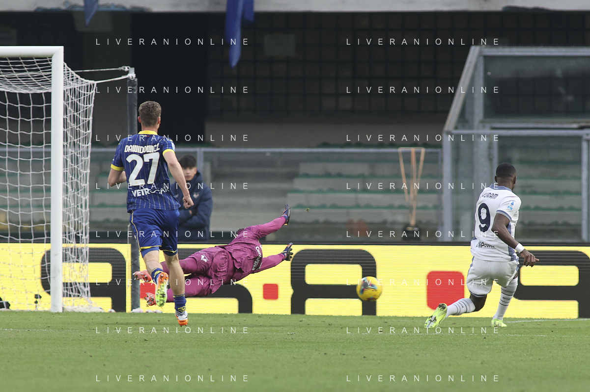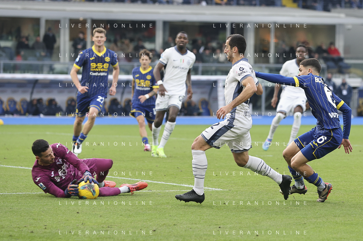 Lorenzo Montipo’ of Hellas Verona FC makes a save on Henrikh Mkhitaryan of Inter FC during Hellas Verona FC vs Inter FC, 13° Serie A Enilive 2024-25 game at Marcantonio Bentegodi stadium in Verona (VR), Italy, on November 23, 2024. (Photo by Davide Casentini)- AGENZIA ALDO LIVERANI SAS