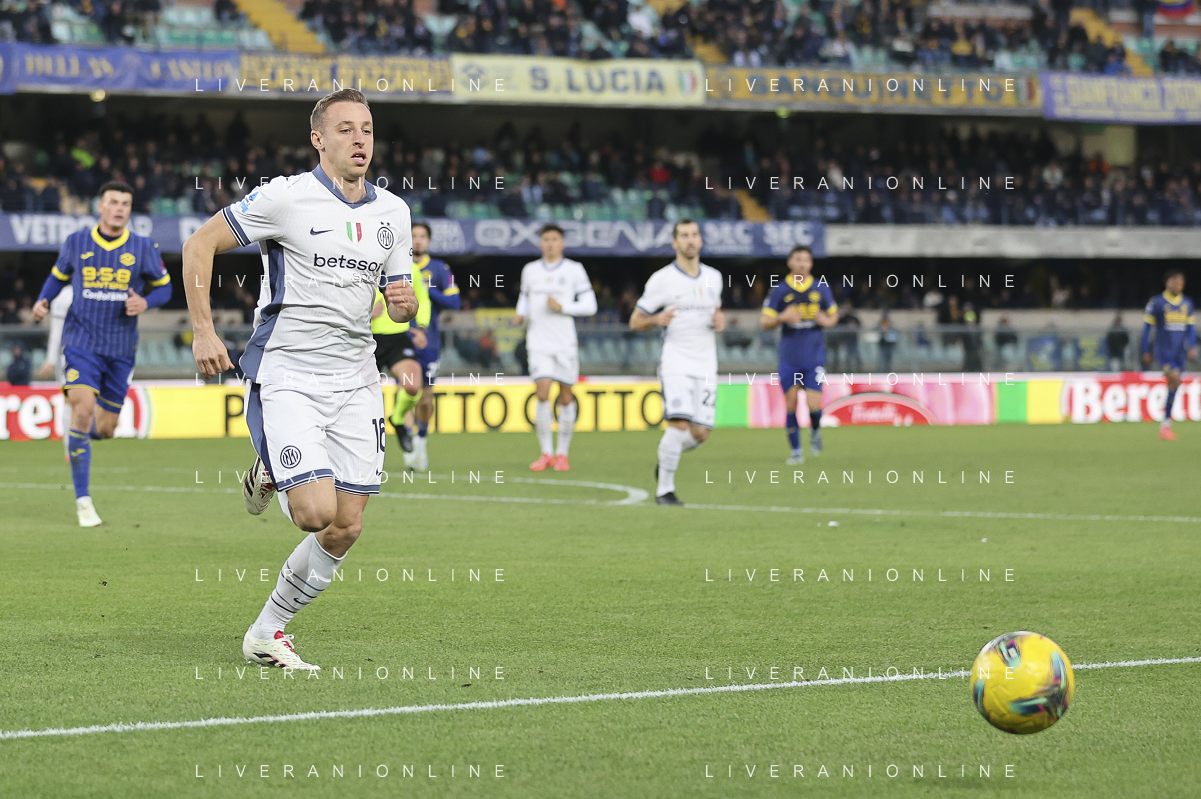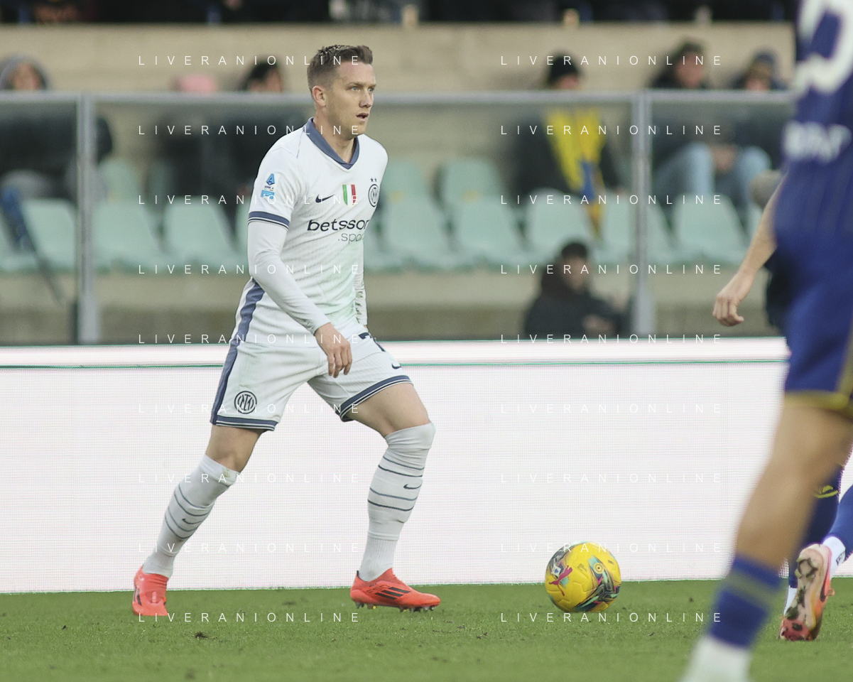 Piotr Zielinski of Inter FC play the ball during Hellas Verona FC vs Inter FC, 13° Serie A Enilive 2024-25 game at Marcantonio Bentegodi stadium in Verona (VR), Italy, on November 23, 2024. (Photo by Davide Casentini)- AGENZIA ALDO LIVERANI SAS