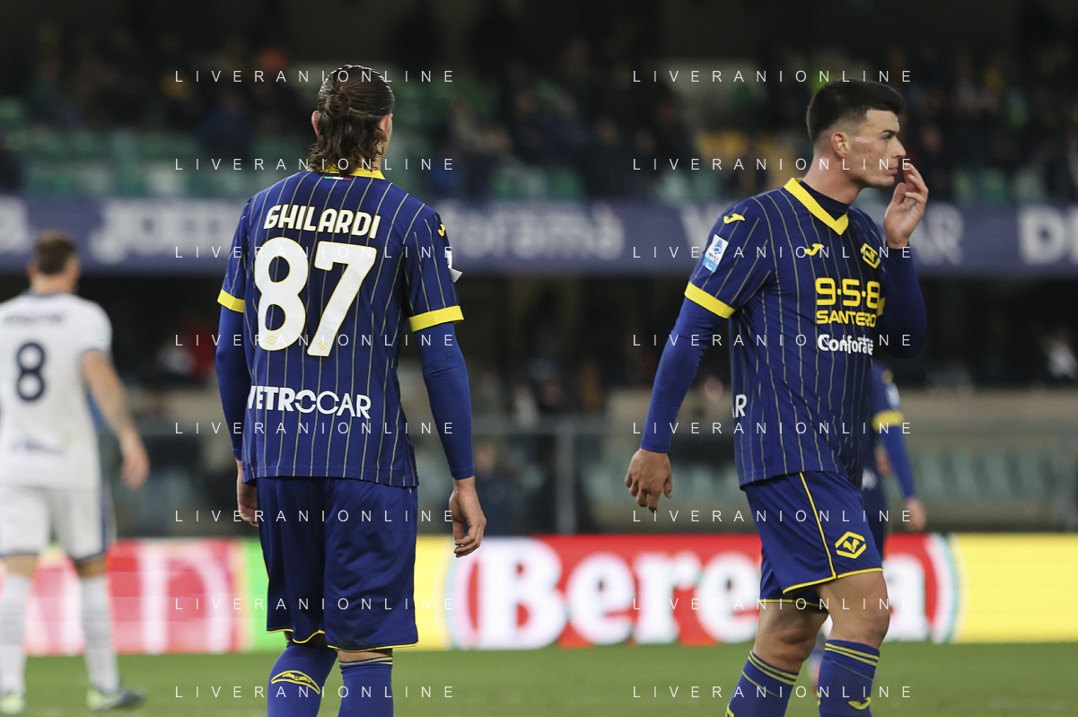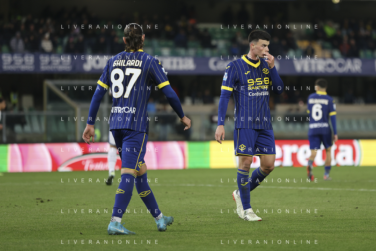 Daniele Ghilardi of Hellas Verona FC, and Flavius Daniliuc of Hellas Verona expresses disappointment during Hellas Verona FC vs Inter FC, 13° Serie A Enilive 2024-25 game at Marcantonio Bentegodi stadium in Verona (VR), Italy, on November 23, 2024. (Photo by Davide Casentini)- AGENZIA ALDO LIVERANI SAS