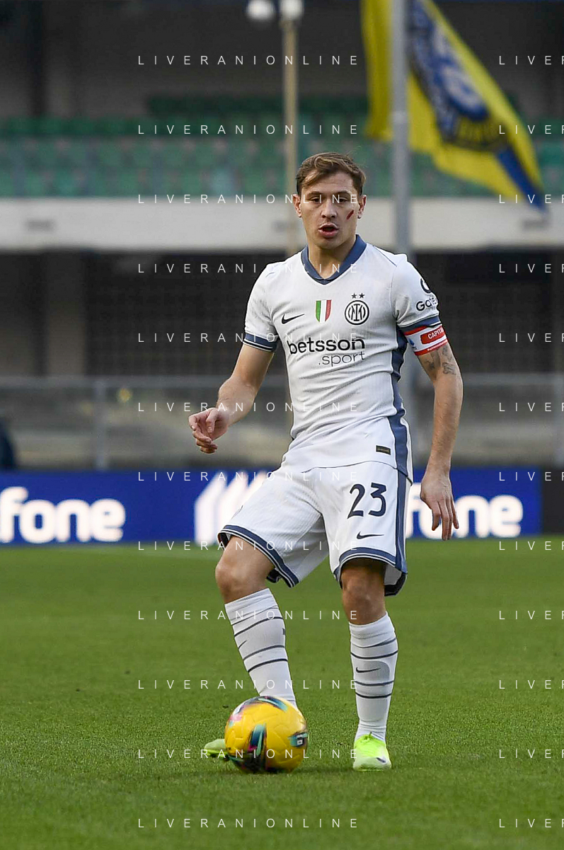 Nicolo’ Barella of Inter FC play the ball during Hellas Verona FC vs Inter FC, 13° Serie A Enilive 2024-25 game at Marcantonio Bentegodi stadium in Verona (VR), Italy, on November 23, 2024. (Photo by Davide Casentini)- AGENZIA ALDO LIVERANI SAS
