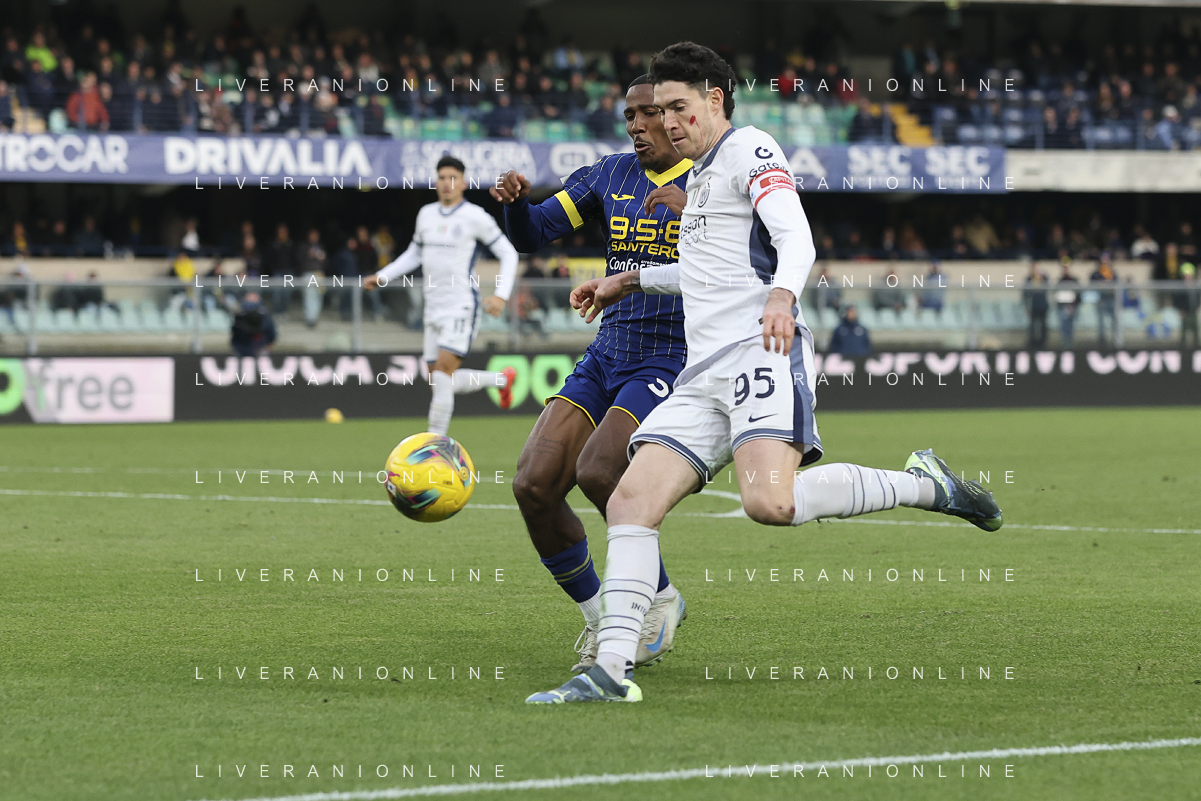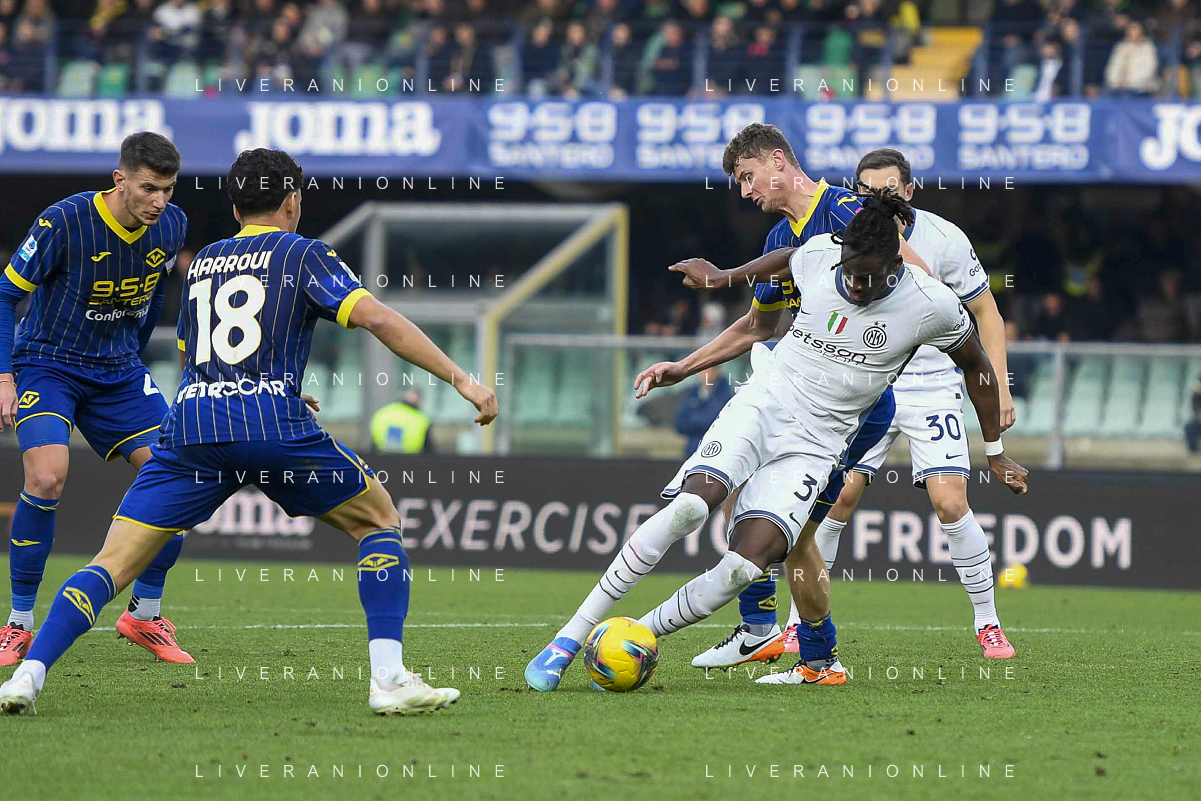 Abdou Harroui of Hellas Verona FC competes for the ball with Yann Aurel Bisseck of Inter FC during Hellas Verona FC vs Inter FC, 13° Serie A Enilive 2024-25 game at Marcantonio Bentegodi stadium in Verona (VR), Italy, on November 23, 2024. (Photo by Davide Casentini)- AGENZIA ALDO LIVERANI SAS
