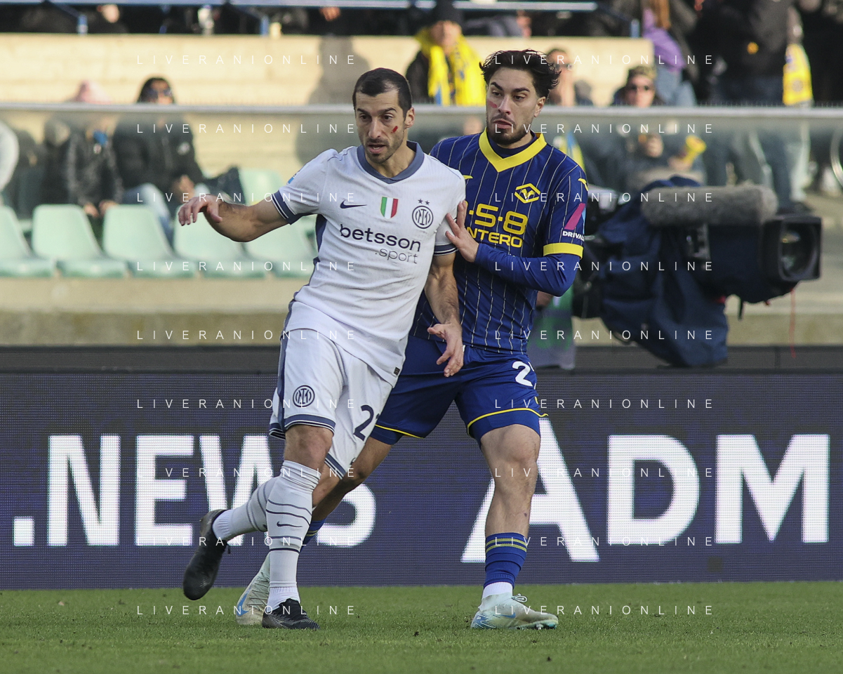 Reda Belahyane of Hellas Verona FC competes for the ball with Henrikh Mkhitaryan of Inter FC during Hellas Verona FC vs Inter FC, 13° Serie A Enilive 2024-25 game at Marcantonio Bentegodi stadium in Verona (VR), Italy, on November 23, 2024. (Photo by Davide Casentini)- AGENZIA ALDO LIVERANI SAS