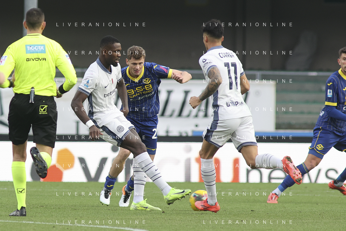 Marcus Thuram of Inter FC competes for the ball with Pawel Dawidowicz of Hellas Verona FC during Hellas Verona FC vs Inter FC, 13° Serie A Enilive 2024-25 game at Marcantonio Bentegodi stadium in Verona (VR), Italy, on November 23, 2024. (Photo by Davide Casentini)- AGENZIA ALDO LIVERANI SAS