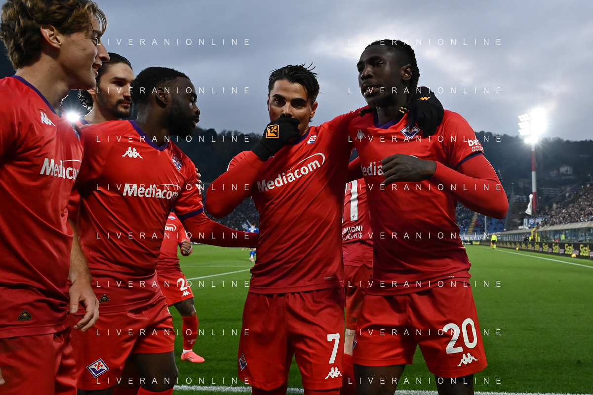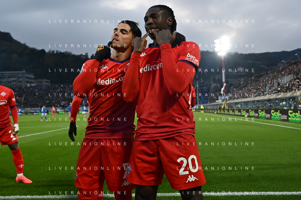 TVRG Como vs Fiorentina nella foto Riccardo Sottil (Fiorentina) e Moise Kean (Fiorentina) esultanza dopo il gol del 2 a 0 Como 24-11-2024 Stadio Giuseppe Sinigaglia Campionato Serie A Enilive - 13a giornata foto Roberto Garavaglia/Agenzia Aldo Liverani sas