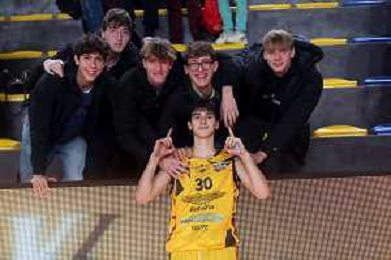 IMOLA 01 12 2024 NEUPHARMA VIRTUS IMOLA BASKET-CAPO D'ORLANDO 85-75 SERIE B1 NELLA FOTO TOMMASO PINZA CON I SUOI AMICI DOPO LA SUA PRIMA PARTITA CON LA VIRTUS ©SANNA - AGENZIA ALDO LIVERANI SAS