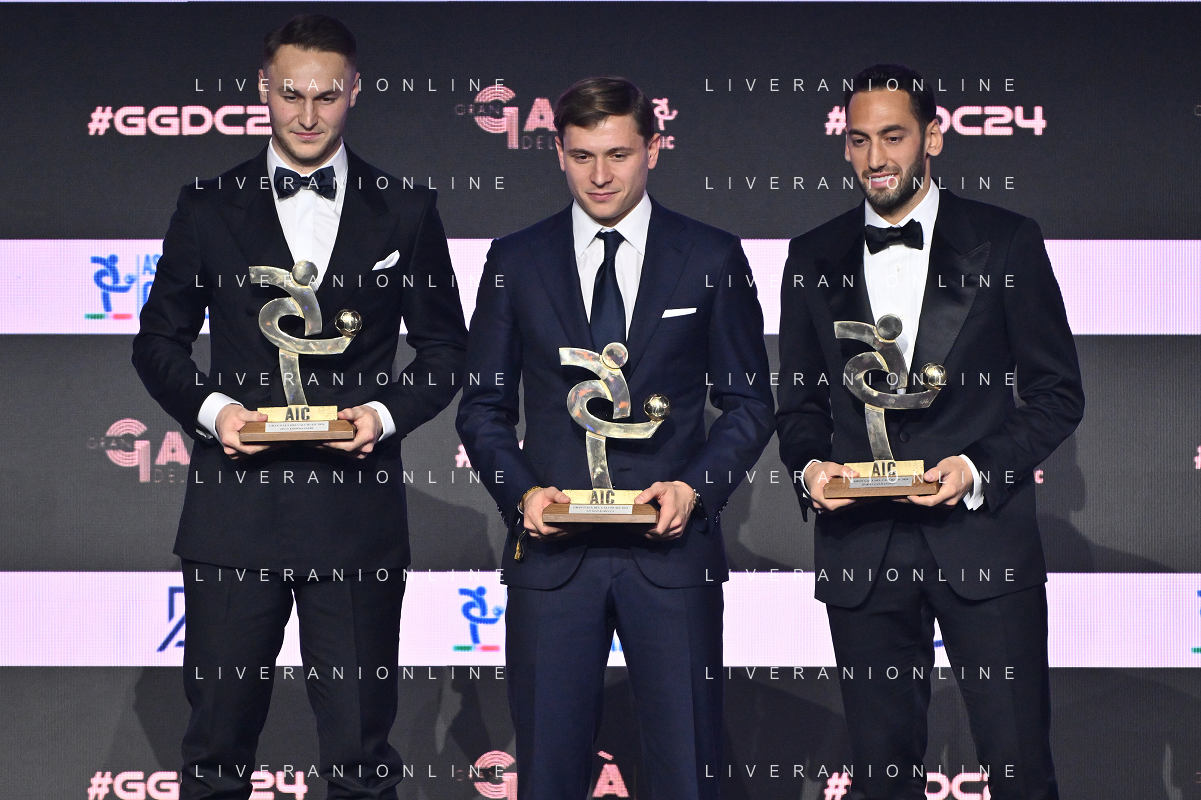 TVRG Gala Calcio 2024 nella foto premiazione migliori centrocampisti, da SX Teun Koopmeiners (Juventus), Nicolò Barella (Inter) e Hakan Calhanoglu (Inter) Milano 02-12-2024 Gran Gala del Calcio 2024, l'appuntamento organizzato dall'AIC Associazione Italiana Calciatori per premiare i protagonisti della stagione 2023-2024 foto Roberto Garavaglia/ag. Aldo Liverani sas