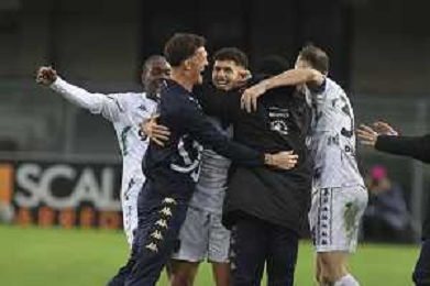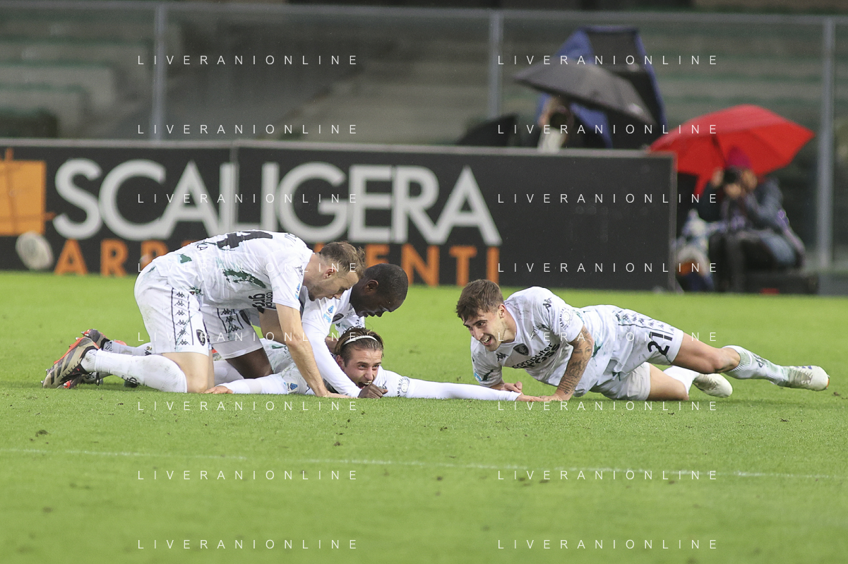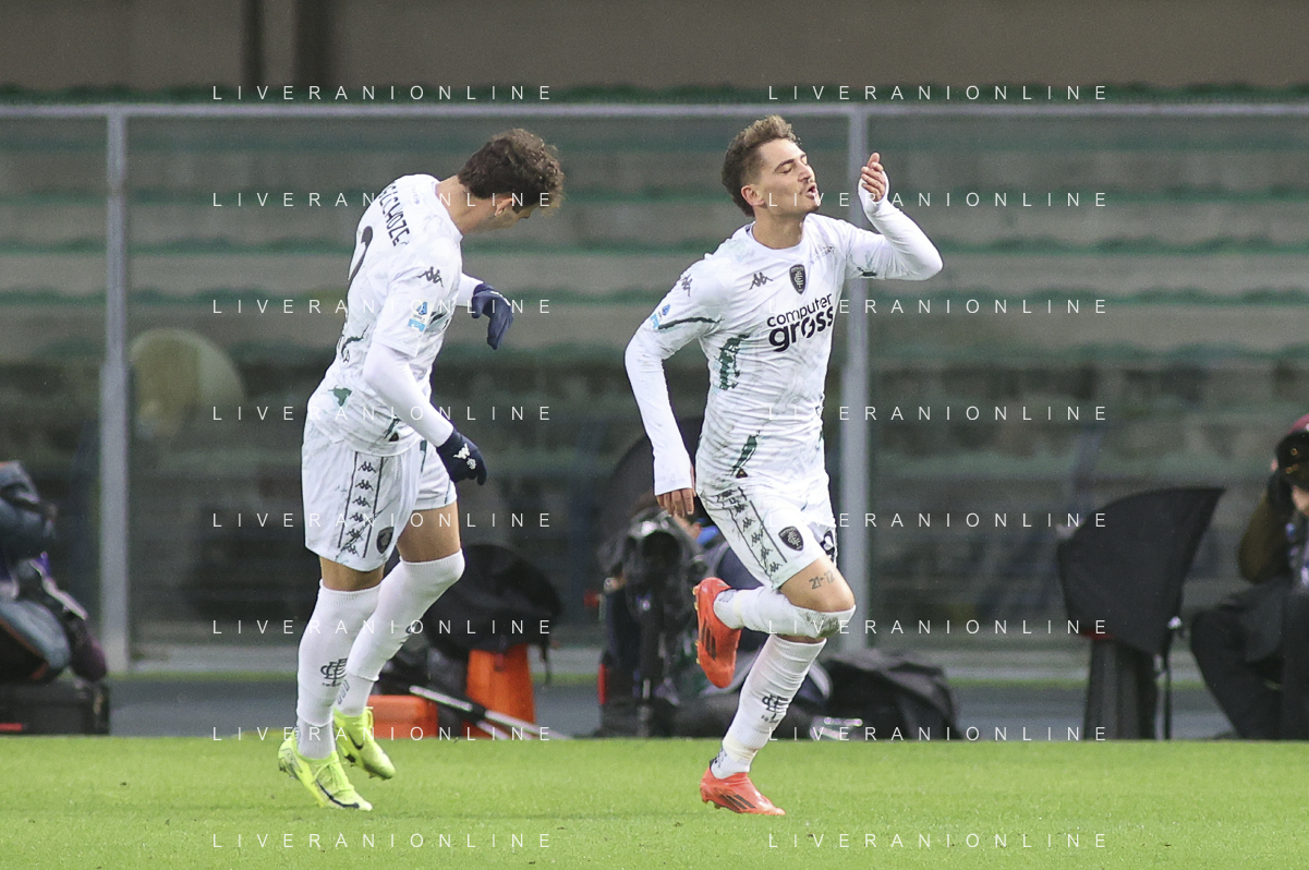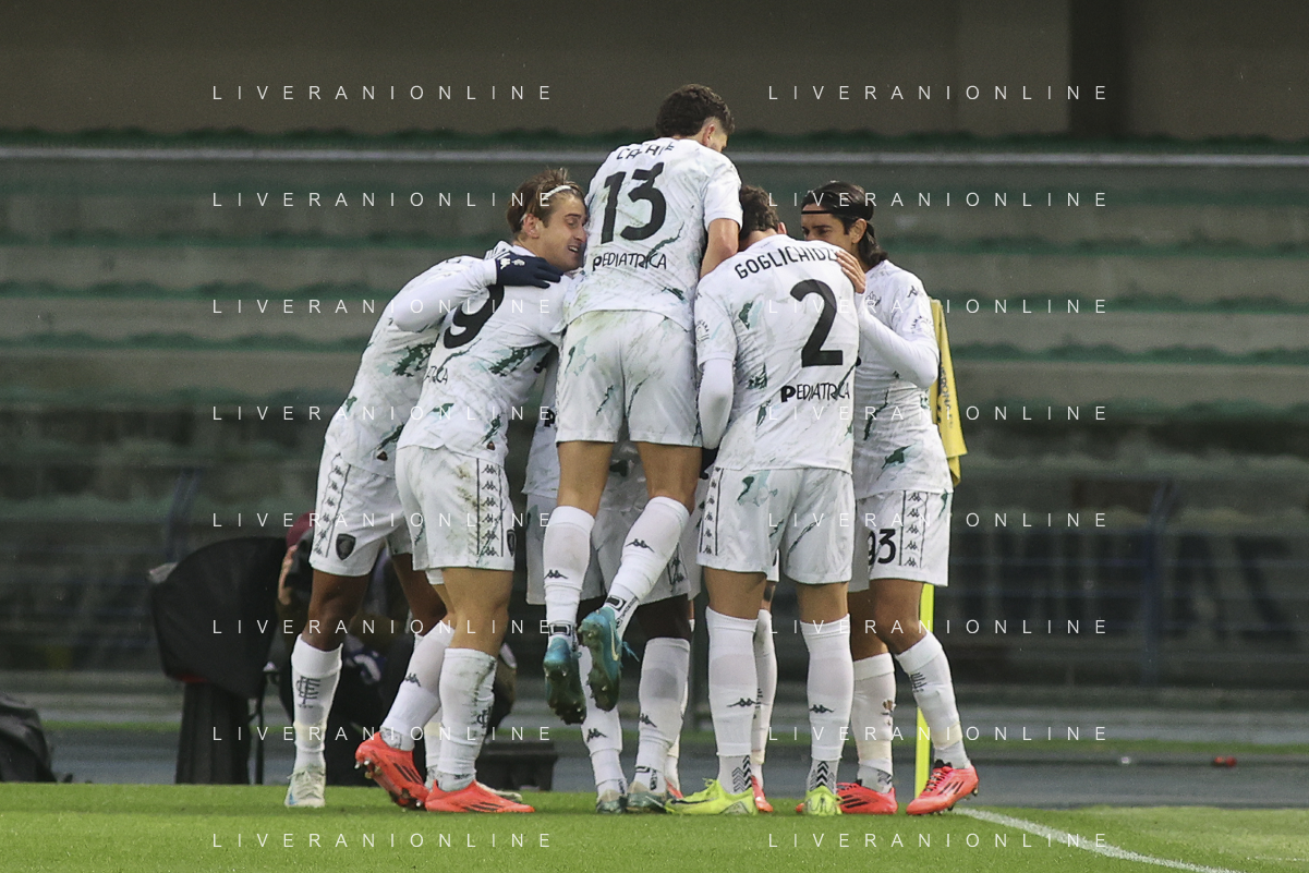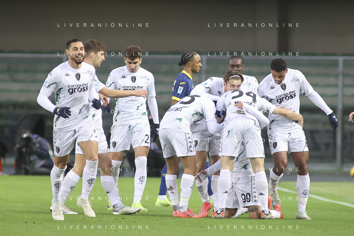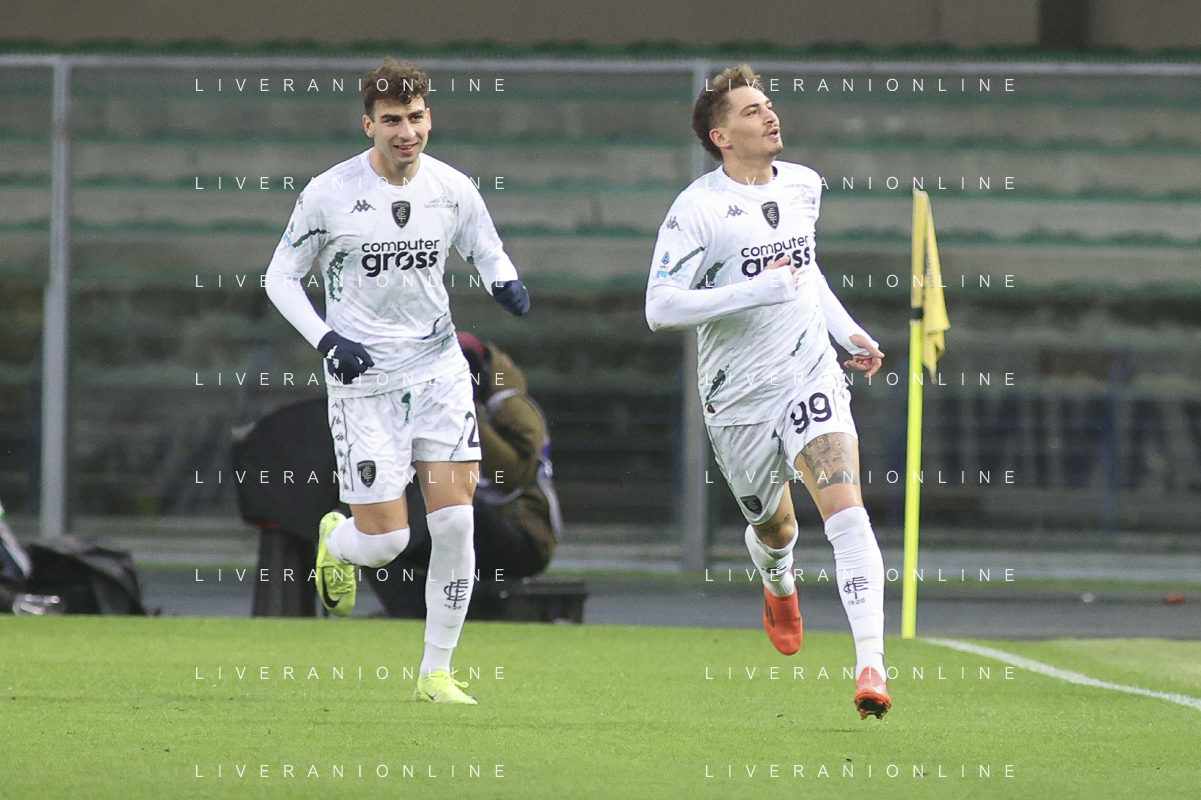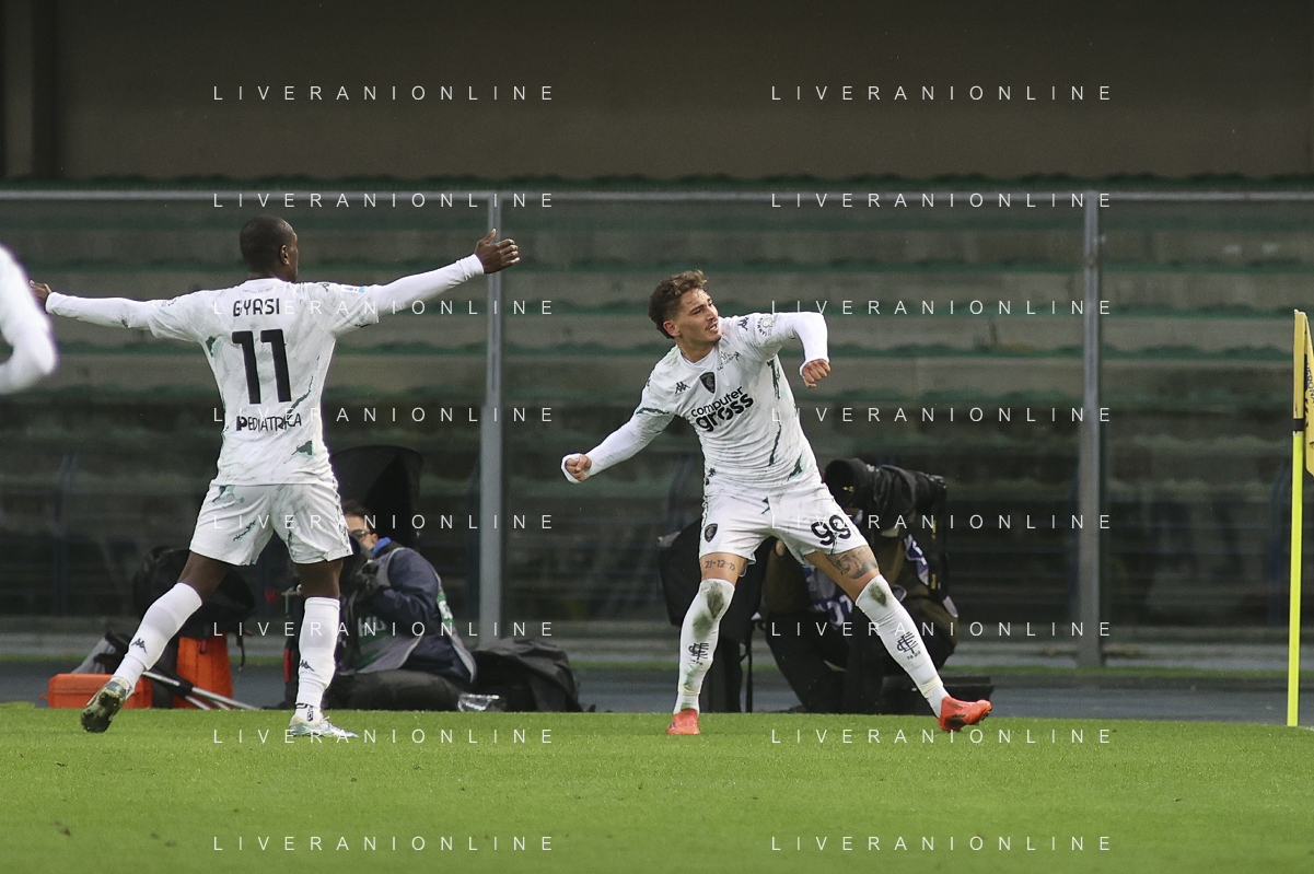 Sebastiano Esposito of Empoli FC celebrates the gol of Liberato Cacace of Empoli FC during Hellas Verona FC vs Empoli FC, 15° Serie A Enilive 2024-25 game at Marcantonio Bentegodi stadium in Verona (VR), Italy, on Dicember 08, 2024. (Photo by Davide Casentini) - AGENZIA ALDO LIVERANI SAS