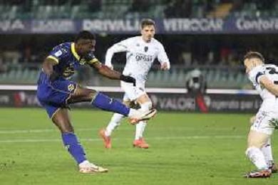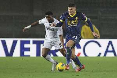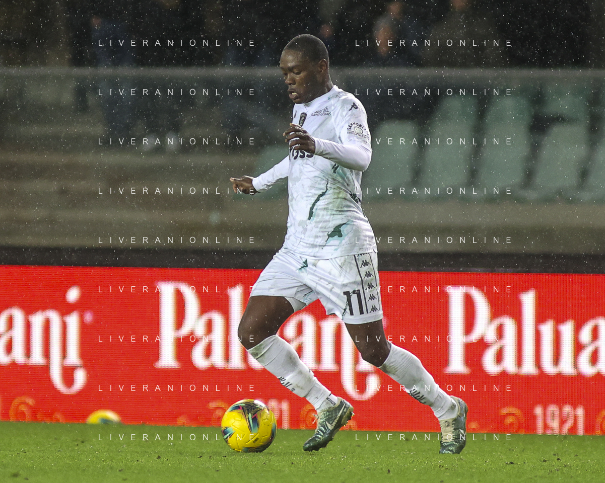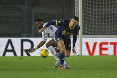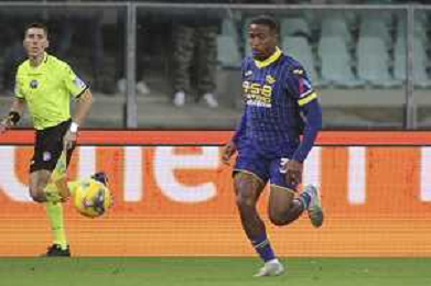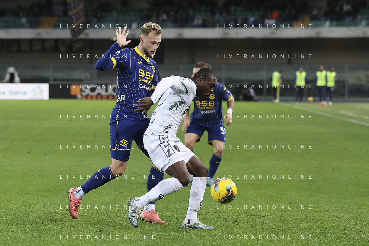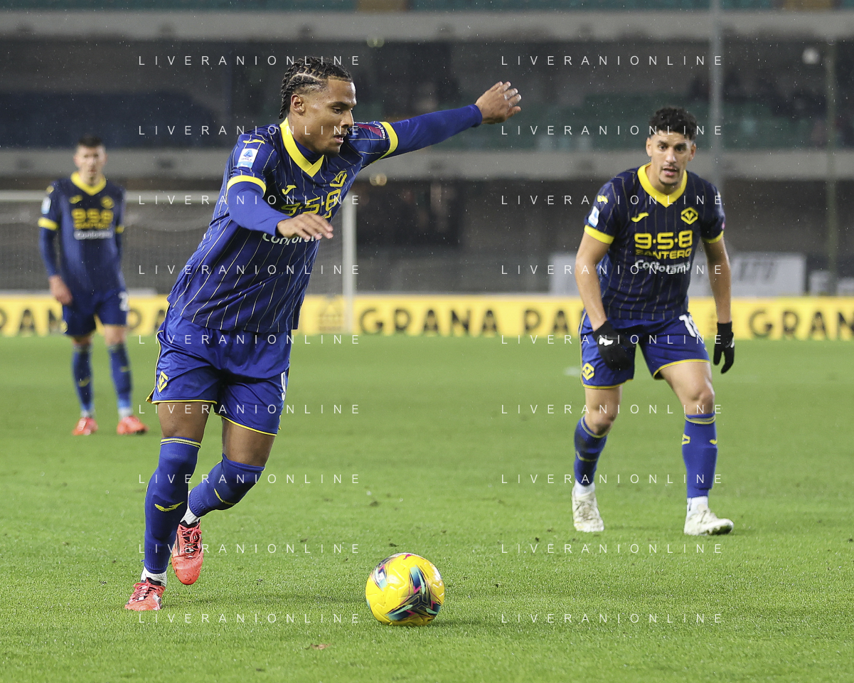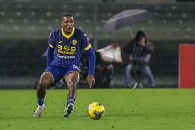 Amin Sarr of Hellas Verona FC play the ball during Hellas Verona FC vs Empoli FC, 15° Serie A Enilive 2024-25 game at Marcantonio Bentegodi stadium in Verona (VR), Italy, on Dicember 08, 2024. (Photo by Davide Casentini)- AGENZIA ALDO LIVERANI SAS