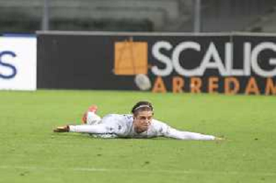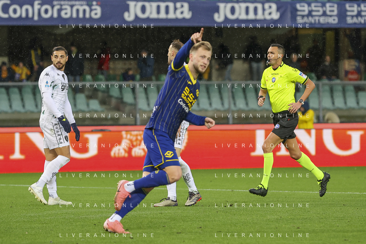 Casper Tengstedt of Hellas Verona FC celebrates after scoring during Hellas Verona FC vs Empoli FC, 15° Serie A Enilive 2024-25 game at Marcantonio Bentegodi stadium in Verona (VR), Italy, on Dicember 08, 2024. (Photo by Davide Casentini)- AGENZIA ALDO LIVERANI SAS