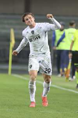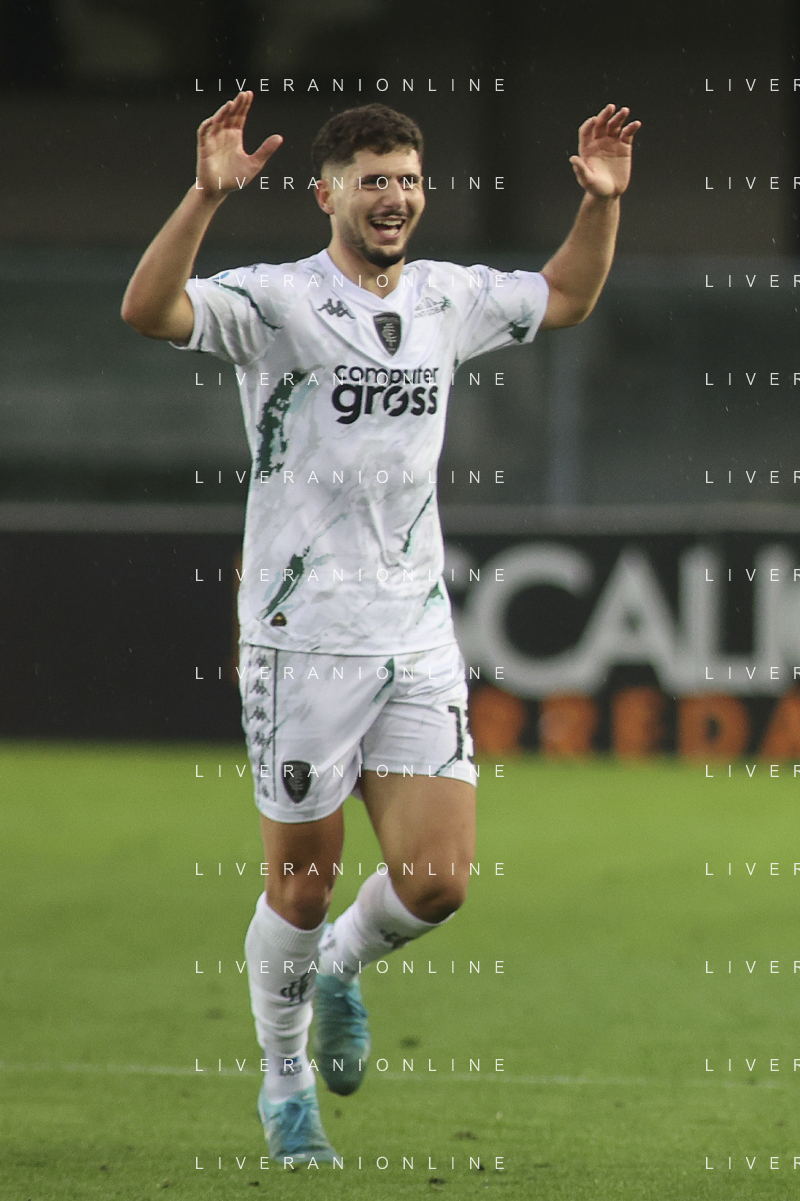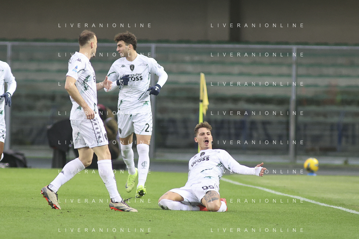 Liberato Cacace of Empoli FC celebrates after scoring during Hellas Verona FC vs Empoli FC, 15° Serie A Enilive 2024-25 game at Marcantonio Bentegodi stadium in Verona (VR), Italy, on Dicember 08, 2024. (Photo by Davide Casentini) - AGENZIA ALDO LIVERANI SAS