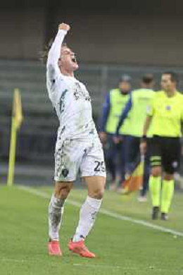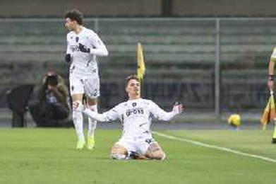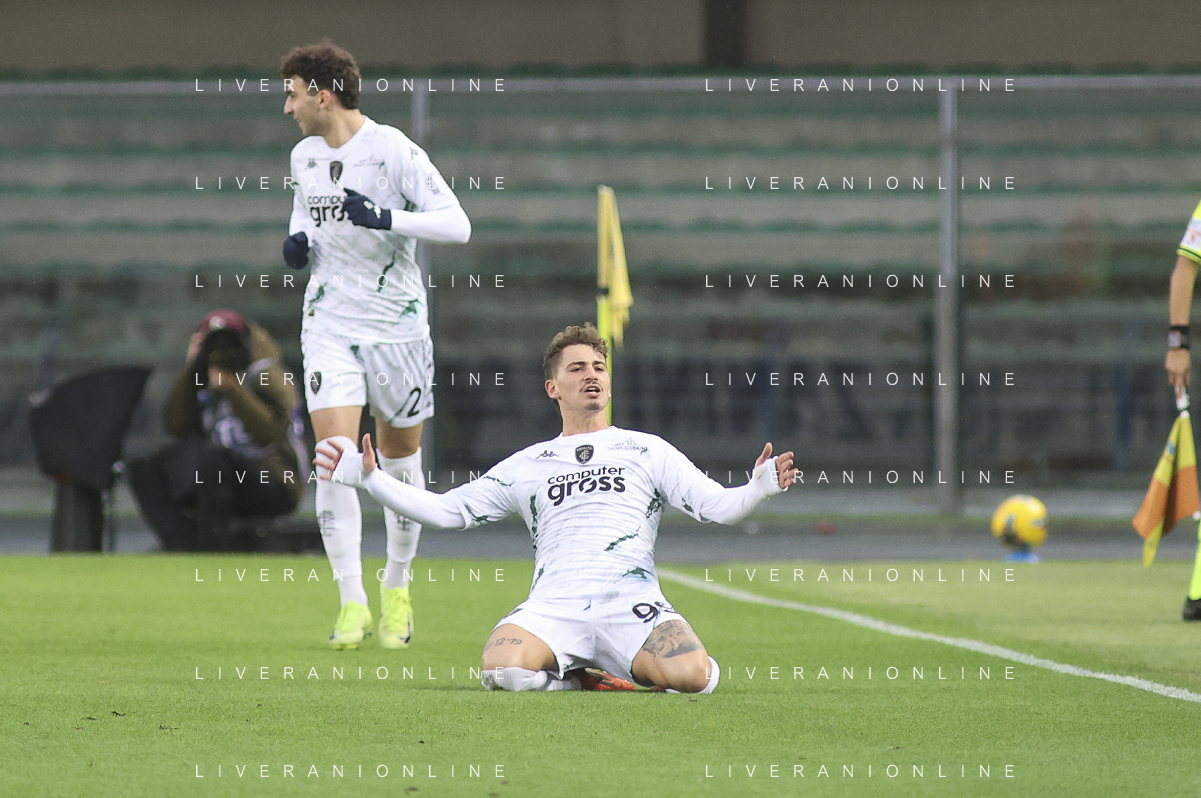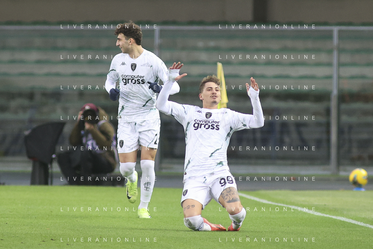 Sebastiano Esposito of Empoli FC celebrates after scoring second gol during Hellas Verona FC vs Empoli FC, 15° Serie A Enilive 2024-25 game at Marcantonio Bentegodi stadium in Verona (VR), Italy, on Dicember 08, 2024. (Photo by Davide Casentini) - AGENZIA ALDO LIVERANI SAS