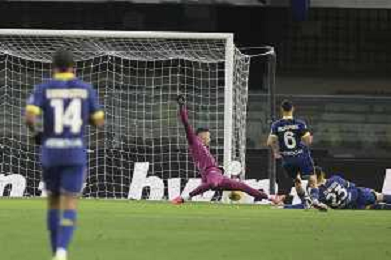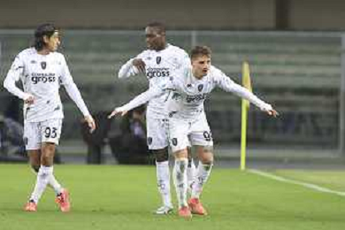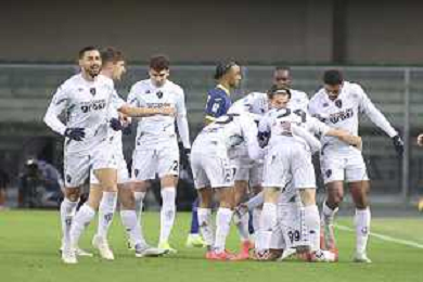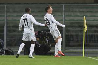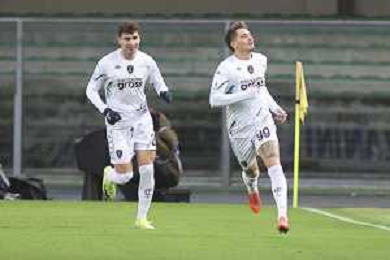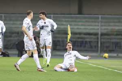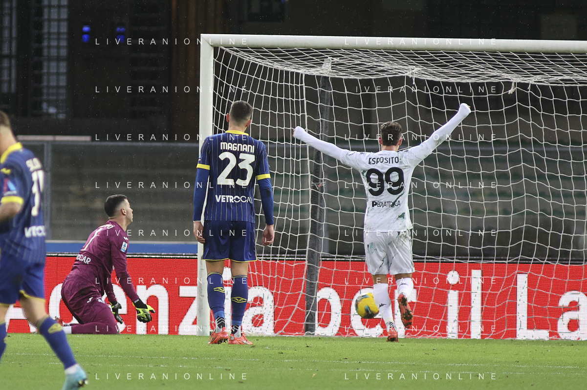 Sebastiano Esposito of Empoli FC scores a wsecond goal during Hellas Verona FC vs Empoli FC, 15° Serie A Enilive 2024-25 game at Marcantonio Bentegodi stadium in Verona (VR), Italy, on Dicember 08, 2024. (Photo by Davide Casentini) - AGENZIA ALDO LIVERANI SAS