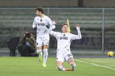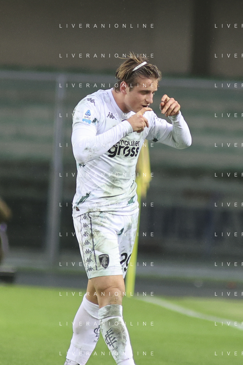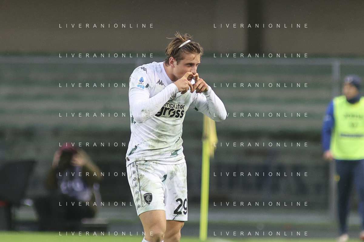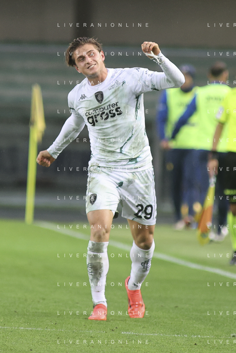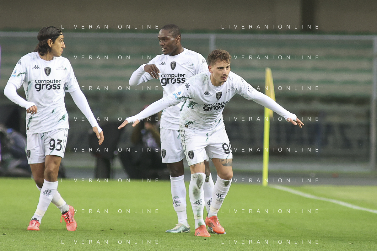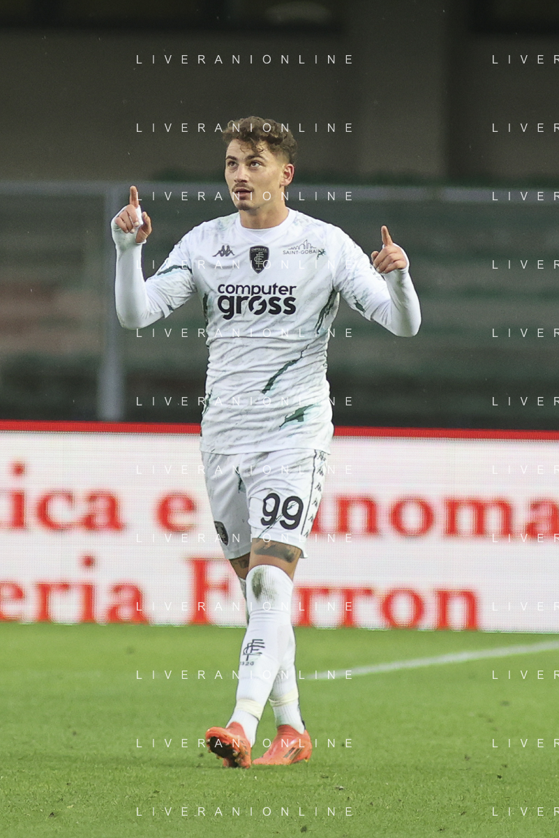 Lorenzo Colombo of Empoli FC celebrates after scoring during Hellas Verona FC vs Empoli FC, 15° Serie A Enilive 2024-25 game at Marcantonio Bentegodi stadium in Verona (VR), Italy, on Dicember 08, 2024. (Photo by Davide Casentini) - AGENZIA ALDO LIVERANI SAS