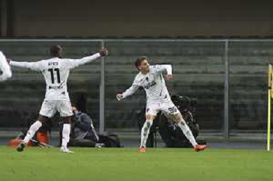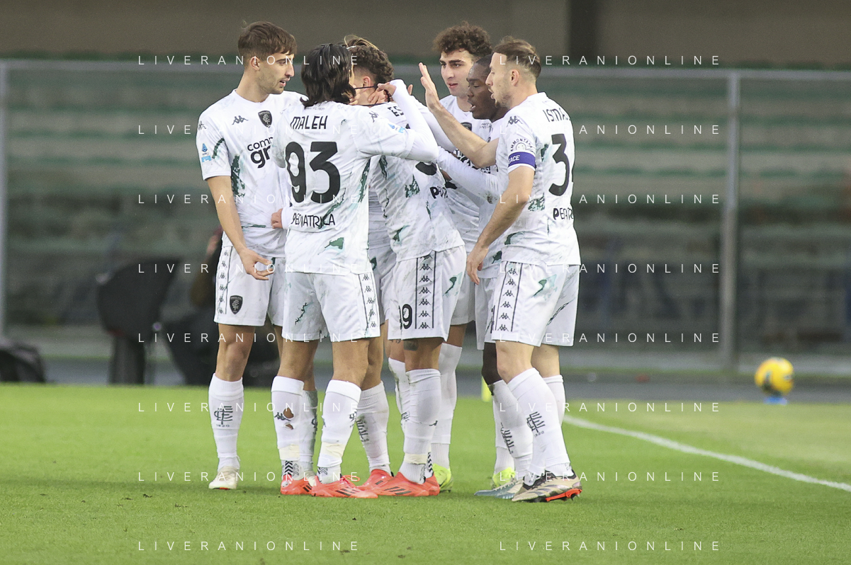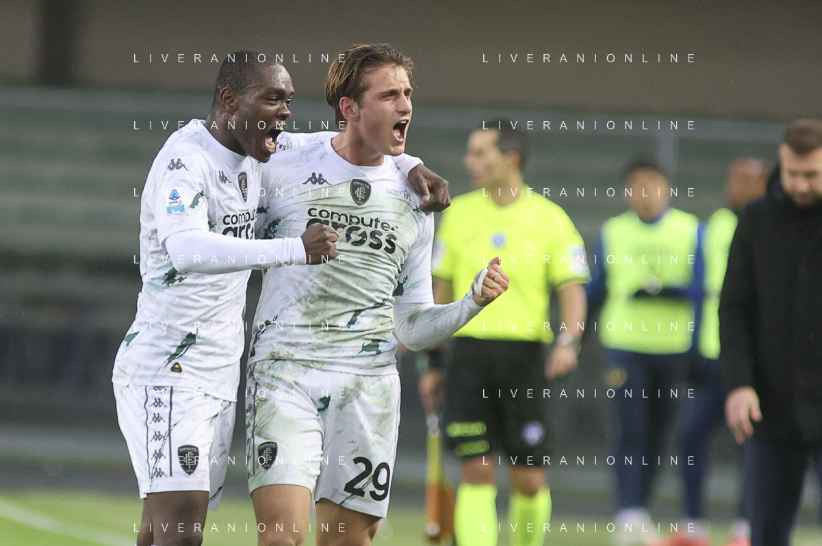 Lorenzo Colombo of Empoli FC celebrates with Emmanuel Gyasi of Empoli FC the gol during Hellas Verona FC vs Empoli FC, 15° Serie A Enilive 2024-25 game at Marcantonio Bentegodi stadium in Verona (VR), Italy, on Dicember 08, 2024. (Photo by Davide Casentini)- AGENZIA ALDO LIVERANI SAS