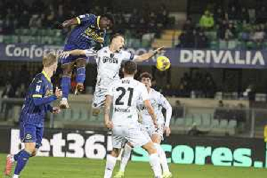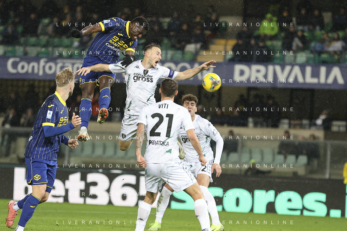 Tino Anjorin of Empoli FC heads the ball during Hellas Verona FC vs Empoli FC, 15° Serie A Enilive 2024-25 game at Marcantonio Bentegodi stadium in Verona (VR), Italy, on Dicember 08, 2024. (Photo by Davide Casentini) - AGENZIA ALDO LIVERANI SAS
