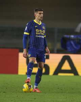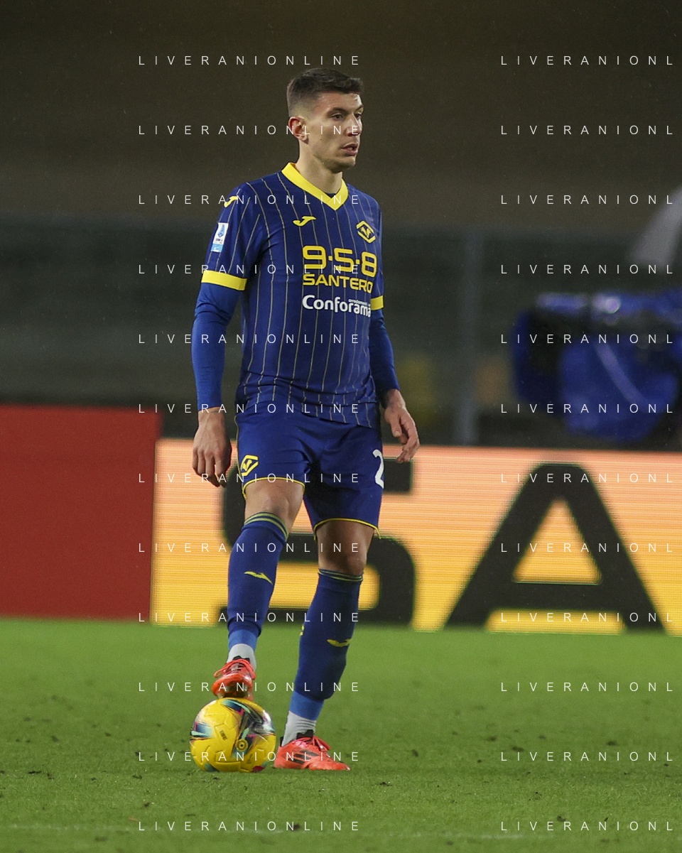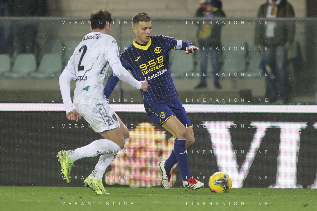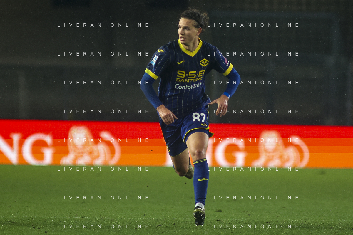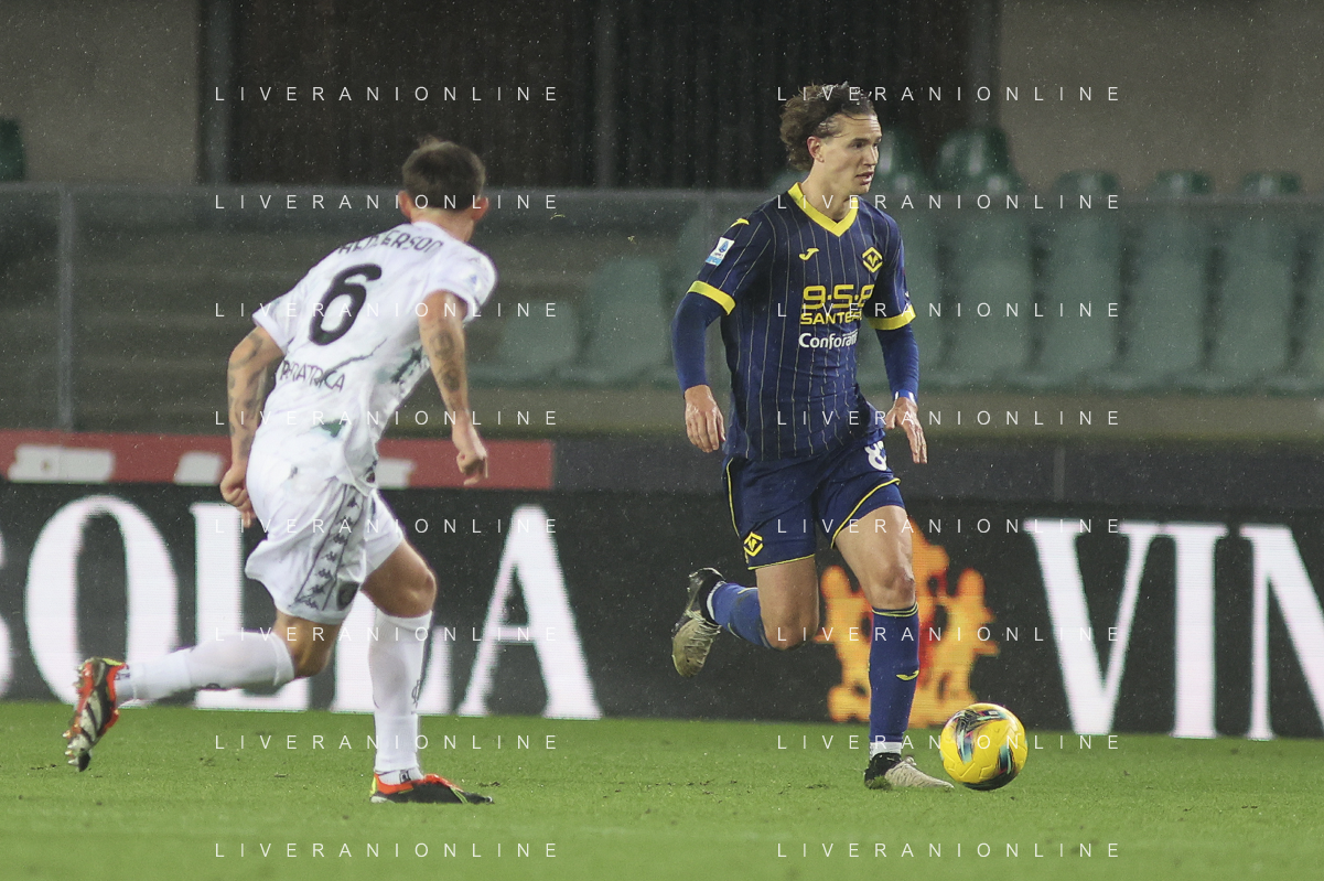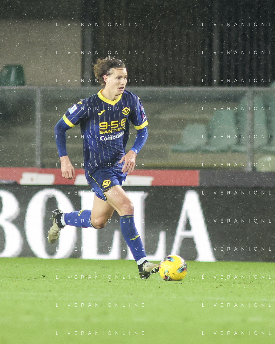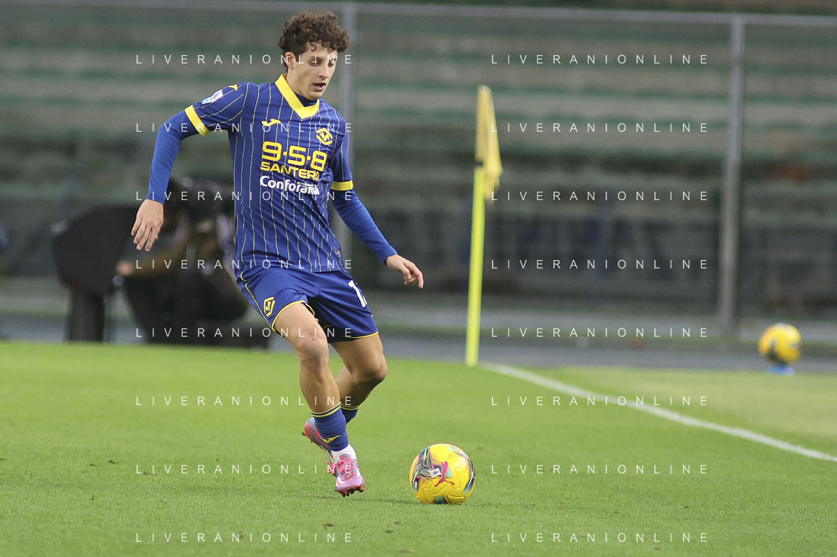 Giangiacomo Magnani of Hellas Verona FC play the ball during Hellas Verona FC vs Empoli FC, 15° Serie A Enilive 2024-25 game at Marcantonio Bentegodi stadium in Verona (VR), Italy, on Dicember 08, 2024. (Photo by Davide Casentini)- AGENZIA ALDO LIVERANI SAS