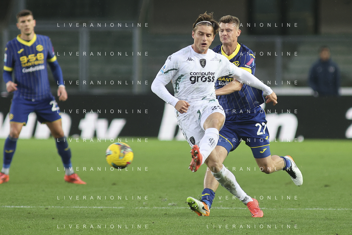 Lorenzo Colombo of Empoli FC play the ball during Hellas Verona FC vs Empoli FC, 15° Serie A Enilive 2024-25 game at Marcantonio Bentegodi stadium in Verona (VR), Italy, on Dicember 08, 2024. (Photo by Davide Casentini) - AGENZIA ALDO LIVERANI SAS