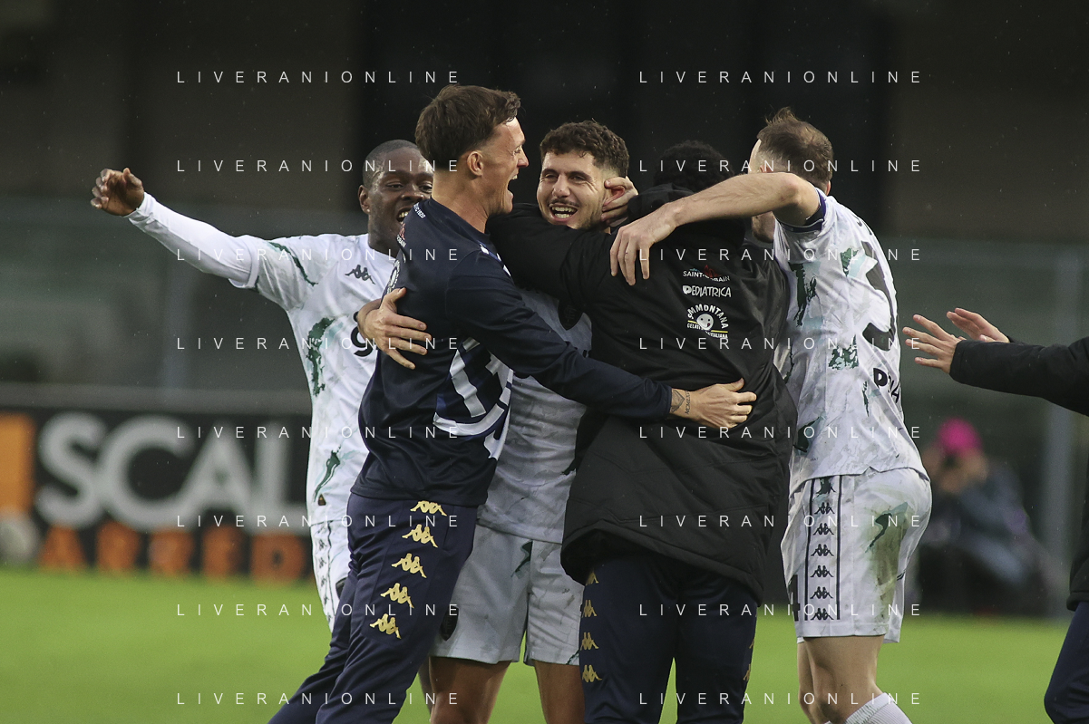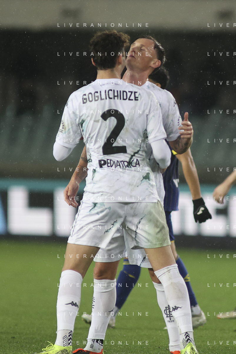 Liam Henderson of Empoli FC and Saba Goglichidze of Empoli FC celebrate the victory at the end of Hellas Verona FC vs Empoli FC, 15° Serie A Enilive 2024-25 game at Marcantonio Bentegodi stadium in Verona (VR), Italy, on Dicember 08, 2024. (Photo by Davide Casentini)- AGENZIA ALDO LIVERANI SAS