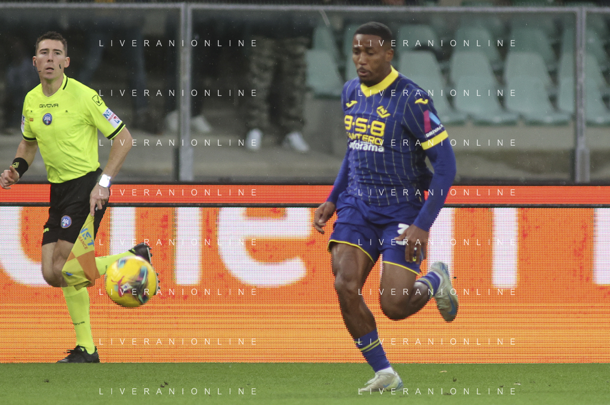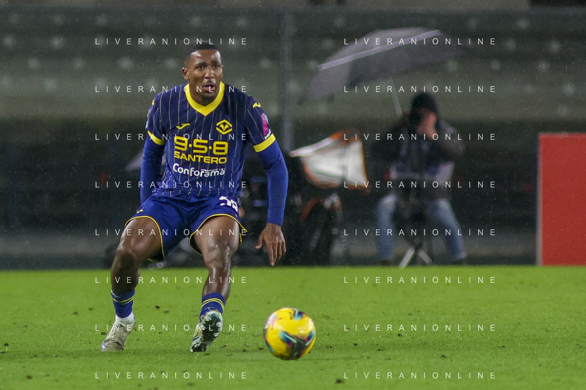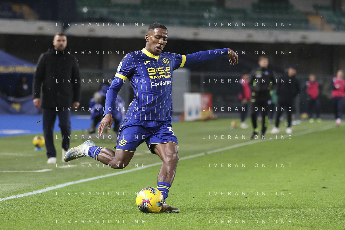 Daniel Mosquera of Hellas Verona FC kick the ball during Hellas Verona FC vs Empoli FC, 15° Serie A Enilive 2024-25 game at Marcantonio Bentegodi stadium in Verona (VR), Italy, on Dicember 08, 2024. (Photo by Davide Casentini)- AGENZIA ALDO LIVERANI SAS