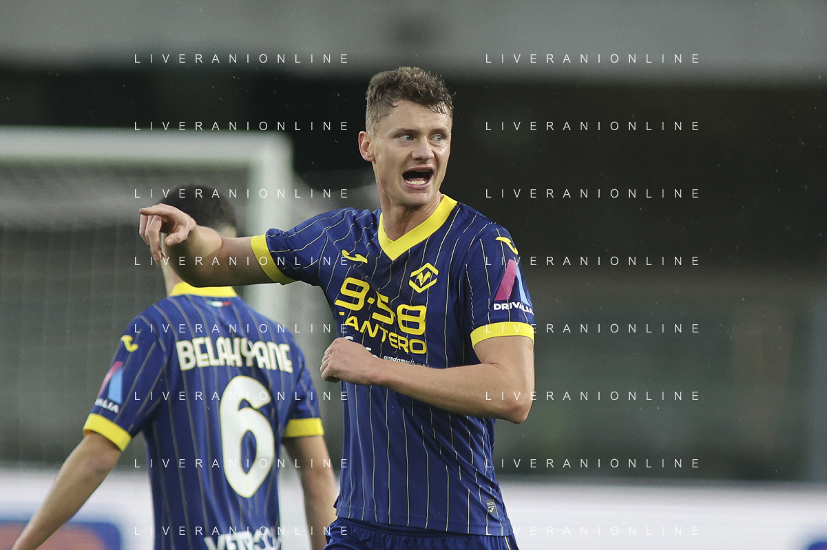 Pawel Dawidowicz of Hellas Verona FC gestures during Hellas Verona FC vs Empoli FC, 15° Serie A Enilive 2024-25 game at Marcantonio Bentegodi stadium in Verona (VR), Italy, on Dicember 08, 2024. (Photo by Davide Casentini) - AGENZIA ALDO LIVERANI SAS